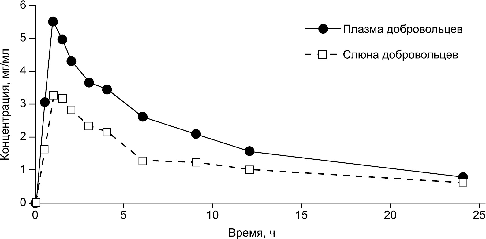 Достижение максимальной концентрации в плазме крови и слюне наблюдалось также через 1 ч после приема изучаемого препарата добровольцами: 5,52±3,07 мкг/мл для плазмы крови, 3,25±0,85 мкг/мл. К 24 ч в среднем обнаруживалось в плазме крови 0,79±0,4 мкг/мл, в слюне — 0,63±0,34 мкг/мл.