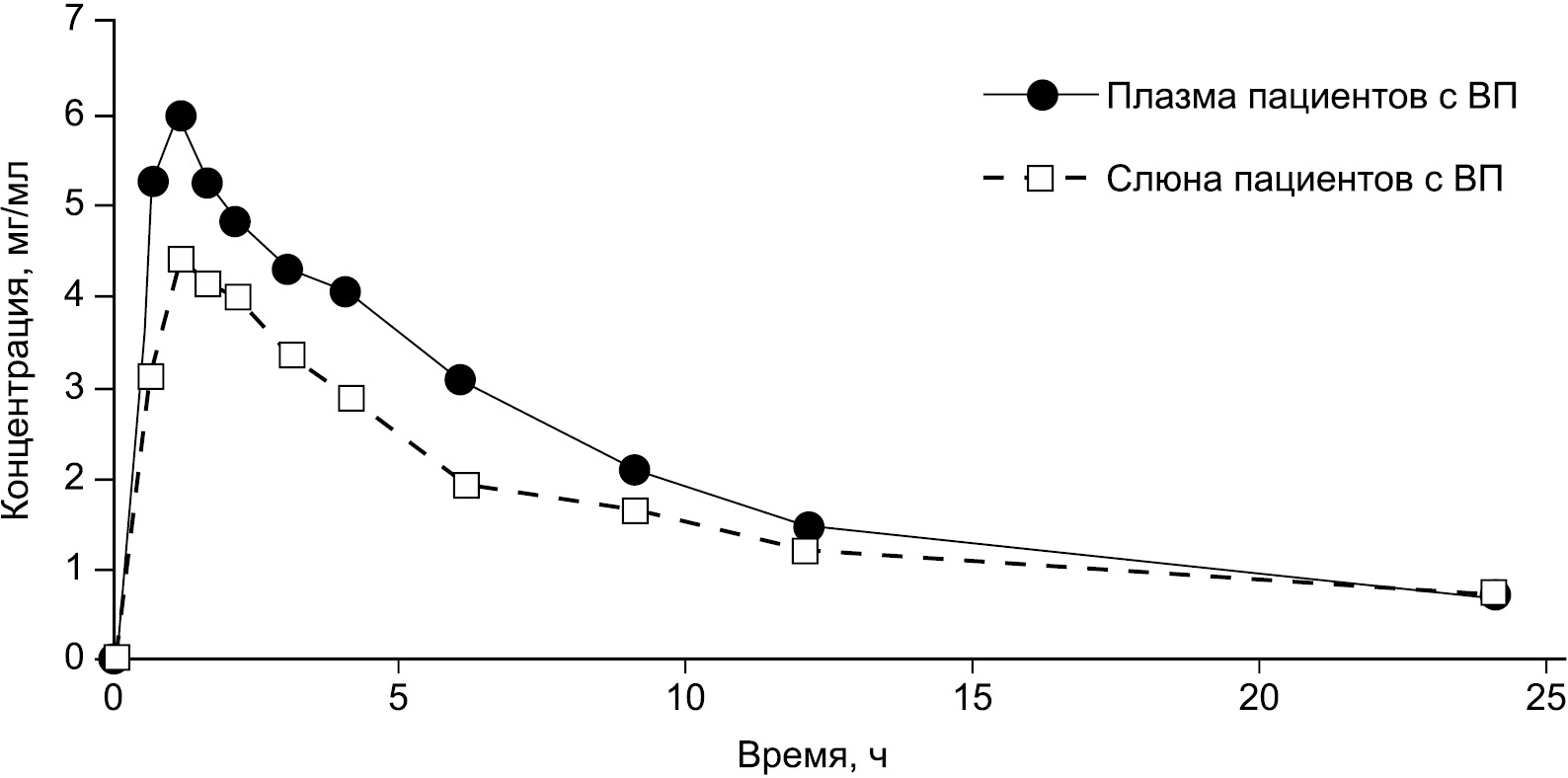 В исследовании были определены концентрации левофлоксацина в плазме крови и слюне после 1-кратного перорального приема в дозе 500 мг пациентами с ВП и добровольцами. Усредненные фармакокинетические кривые представлены на рис. 1 и 2, где анализируемое вещество определялось в течение 24 ч.