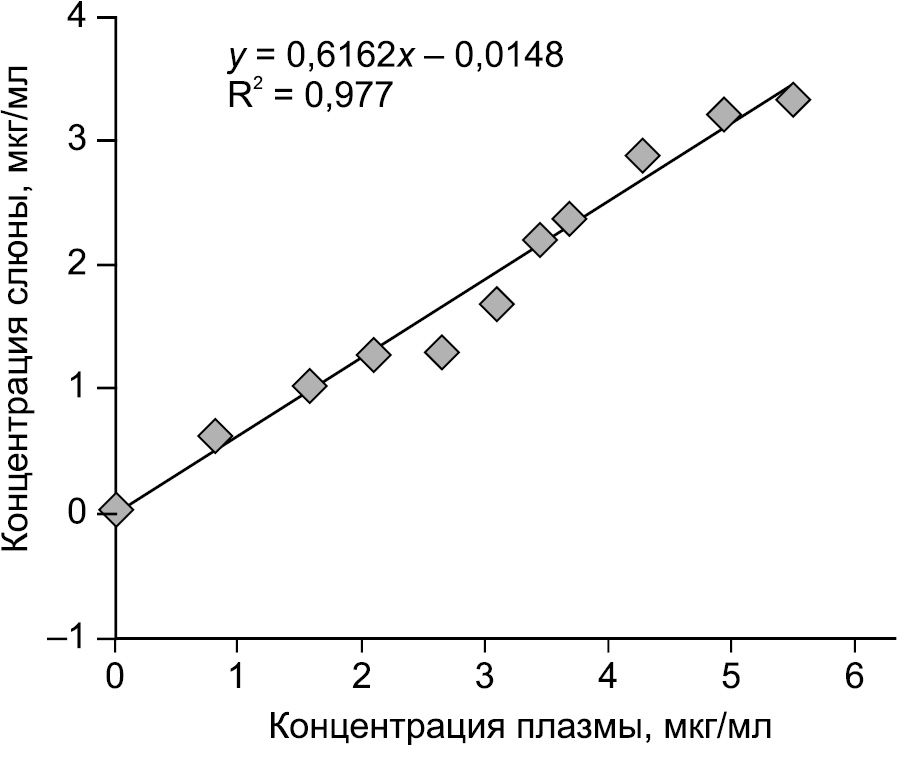 Между исследуемыми признаками и в пробах пациентов с ВП и в пробах добровольцев выявлена высокая степень линейной корреляции, сила связи признаков по шкале Чеддока весьма высокая. Коэффициент корреляции (r) между средними значениями концентраций левофлоксацина в плазме крови и в слюне пациентов с ВП составил 0,953, добровольцев — 0,977. Коэффициент детерминации (R2) уравнения парной линейной регрессии в плазме крови и в слюне пациентов с ВП и добровольцев равен 0,913 и 0,96 соответственно. Средняя ошибка аппроксимации не превышает 10%.