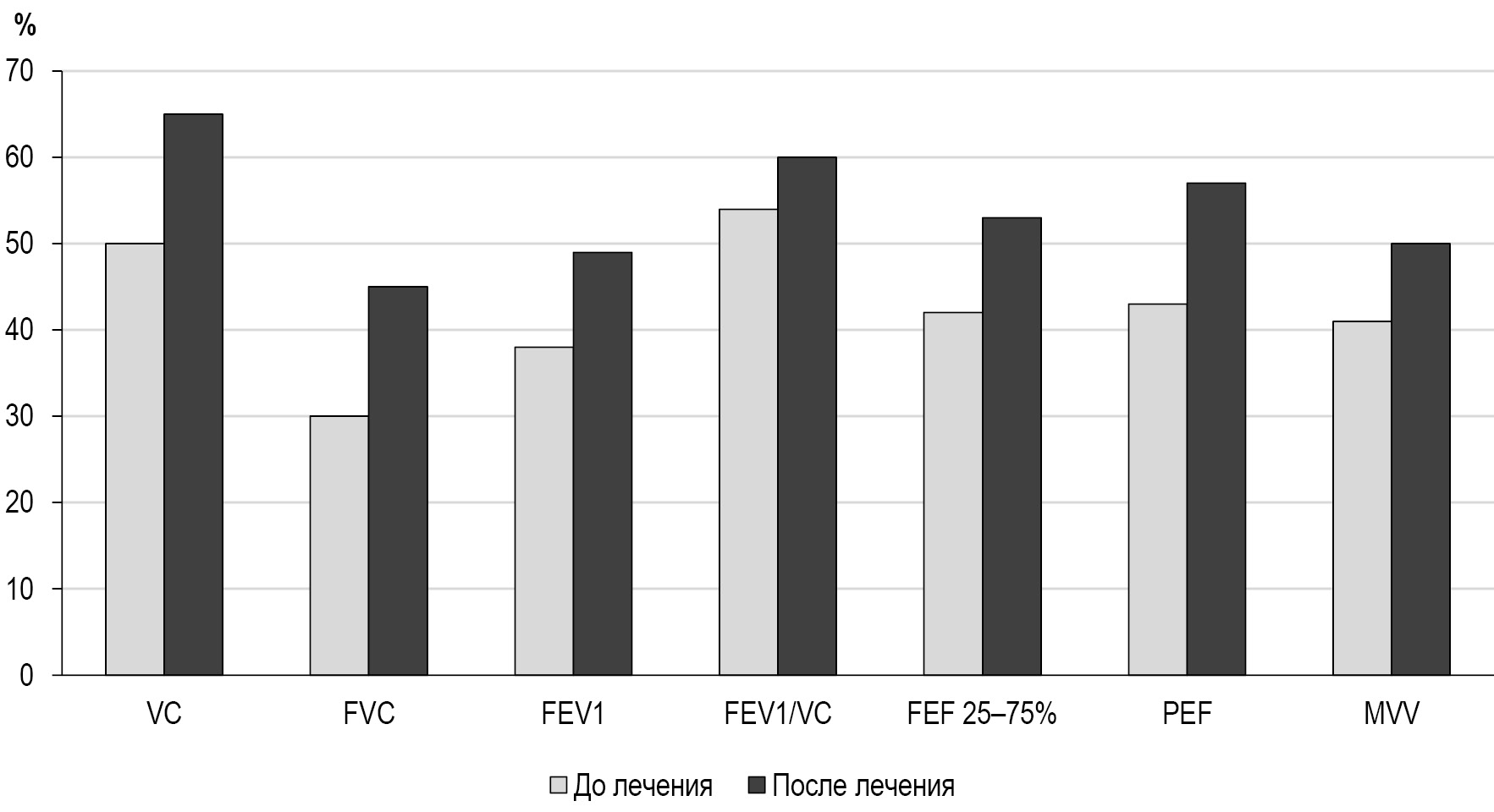 Из табл. 1 видно, что после лечения статистически значимо увеличились VC и показатели бронхиальной проходимости. VC возросла с 1,828±0,134 до 2,155±0,143 л (р <0,0002), т.е. с 53,60±3,50% до 64,15±3,95%. FVC возросла с 1,027±0,100 до 1,456±0,120 л (p <0,0004). Значение теста Тиффно возросло с 53,68 до 59,76%. MVV увеличилась с 40,20±4,90 до 49,063±4,480 л/мин (p <0,0095).