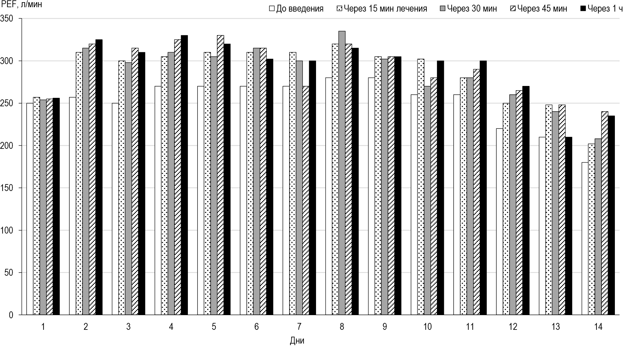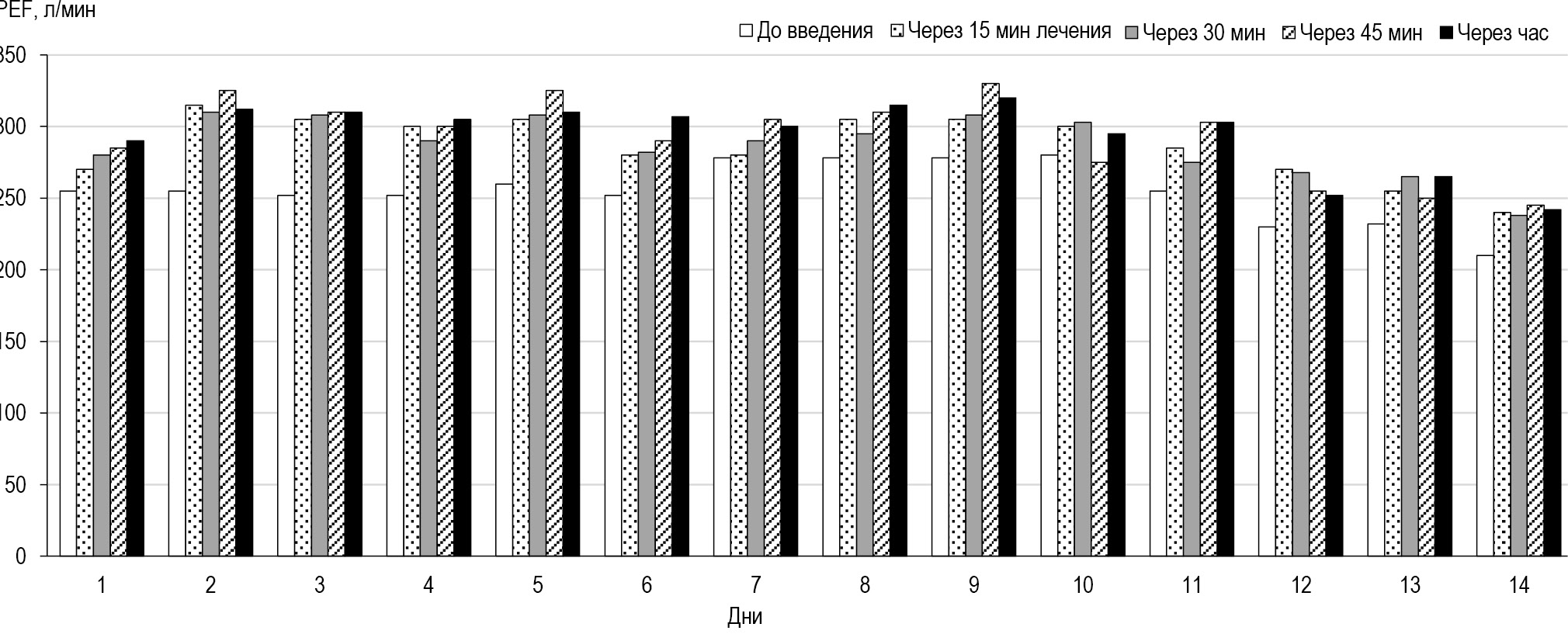 Все указанные показатели изучали до старта лечения, в течение суток каждые 3 ч, а затем в течение недели — в начале лечения и в конце его (каждые 3 ч). До и сразу после ингаляции Беротеком® через 15, 30, 45, 60, 120, 180 мин проводили пикфлоуметрию. Кроме этого, выполняли компьютерную спирометрию с анализом кривой «поток–объём» однократно до и после лечения.