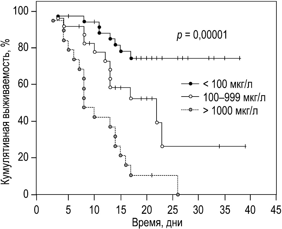 Оценивая влияние Тр-hs на госпитальную выживаемость и смертность, весь ряд его значений мы разделили на 4 группы по уровню концентрации: 1-я группа — до 100 мкг/л (n = 38), 2-я группа — от 100 до 999 мкг/л (n=28), 3-я группа — от 1000 до 9999 мкг/л (n=14) и 4-я группа — более 10 000 мкг/л (n=5). Кривые выживаемости в 3-й и 4-й группах вели себя идентично, в связи с чем были объединены в общую группу. Госпитальная выживаемость в группе пациентов с уровнем Тр-hs менее 100 мкг/л оказалась наилучшей (p=0,00001) (рис. 1).