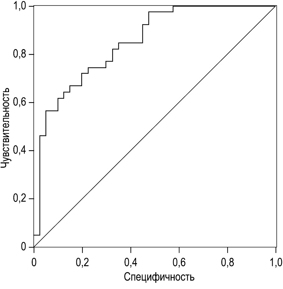 Проведенный ROC-анализ также продемонстрировал высокую прогностическую взаимосвязь между уровнем Тр-hs и летальным исходом у пациентов с COVID-19 — площадь под ROC-кривой составила 0,849±0,042 с 95% ДИ 0,766–0,993 с высокой степенью значимости (p <0,001). Пороговое значение Тр-hs составило 165,13 мкг/л, чувствительность и специфичность метода 74,4% и 77,5% соответственно (рис. 2).