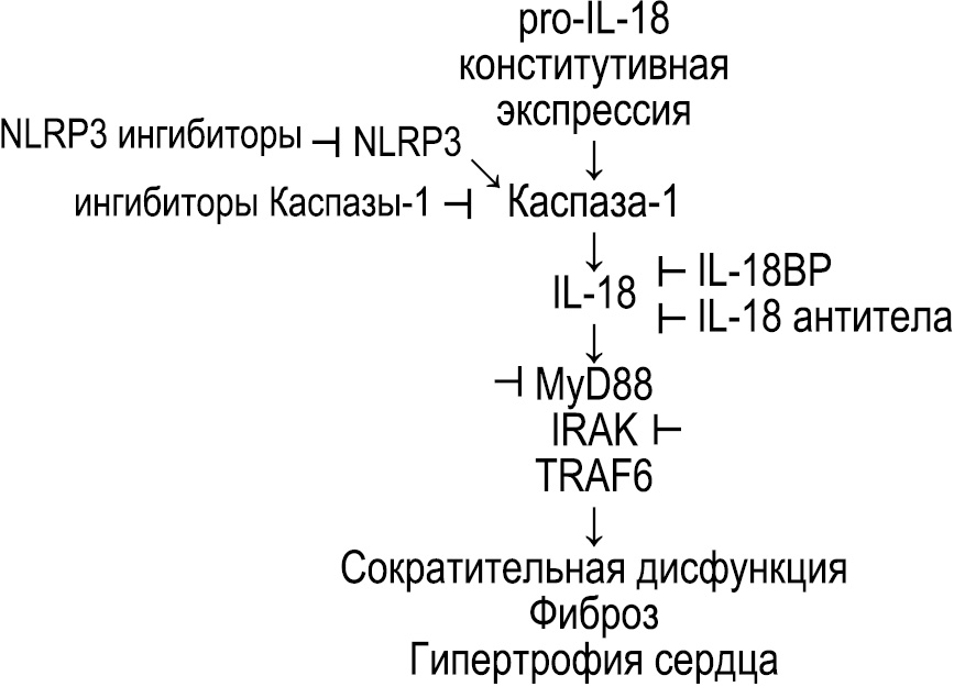 На животных моделях острого инфаркта миокарда (ИМ), перегрузки давлением и дисфункции левого желудочка (ЛЖ) показано, что IL-18 увеличивает гипертрофию кардиомиоцитов, индуцирует сердечно-сократительную дисфункцию и ремоделирование внеклеточного матрикса [23]. Основные патогенетические звенья, связанные с IL-18 у пациентов с ССЗ, представлены на рис.