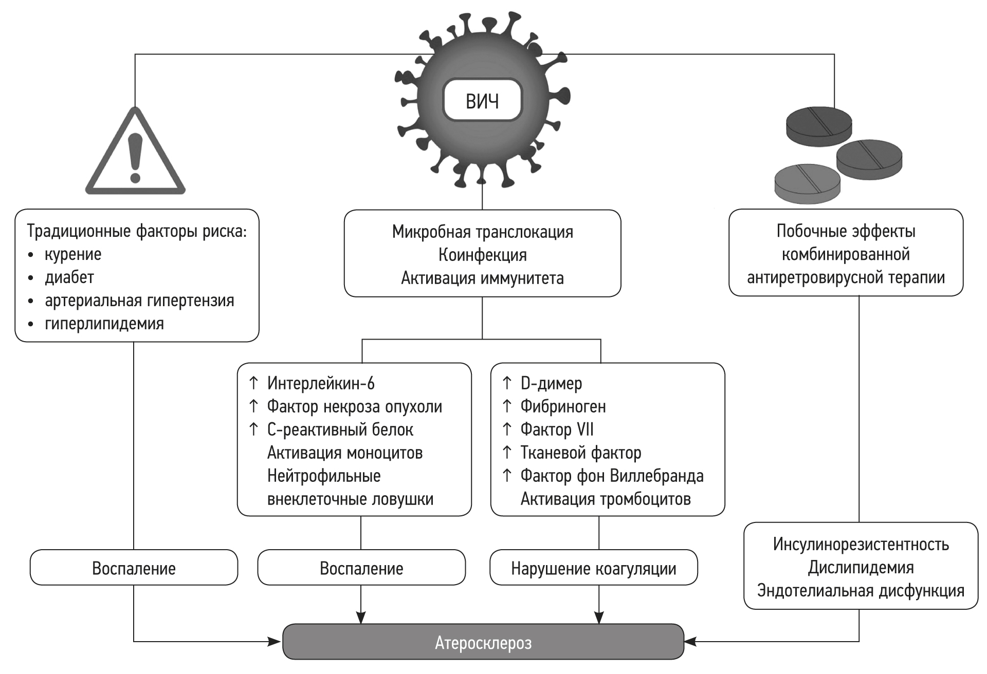 На фоне постоянной АРТ ВИЧ-инфекция контролируется, но не излечивается. Транскрипция генов ВИЧ сохраняется на минимально низком уровне даже при неопределяемом уровне вирусной нагрузки [10]. Кодируемые ВИЧ белки, в частности трансактиватор транскрипции (Tat) и негативный фактор (Nef), вызывают воспаление и дисфункцию эндотелия, а белок оболочки gp120 стимулирует выработку эндотелина, что усиливает процесс атерогенеза [9, 10].