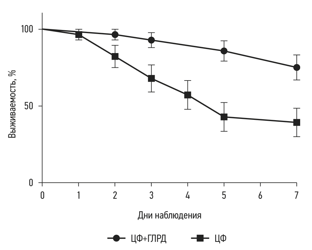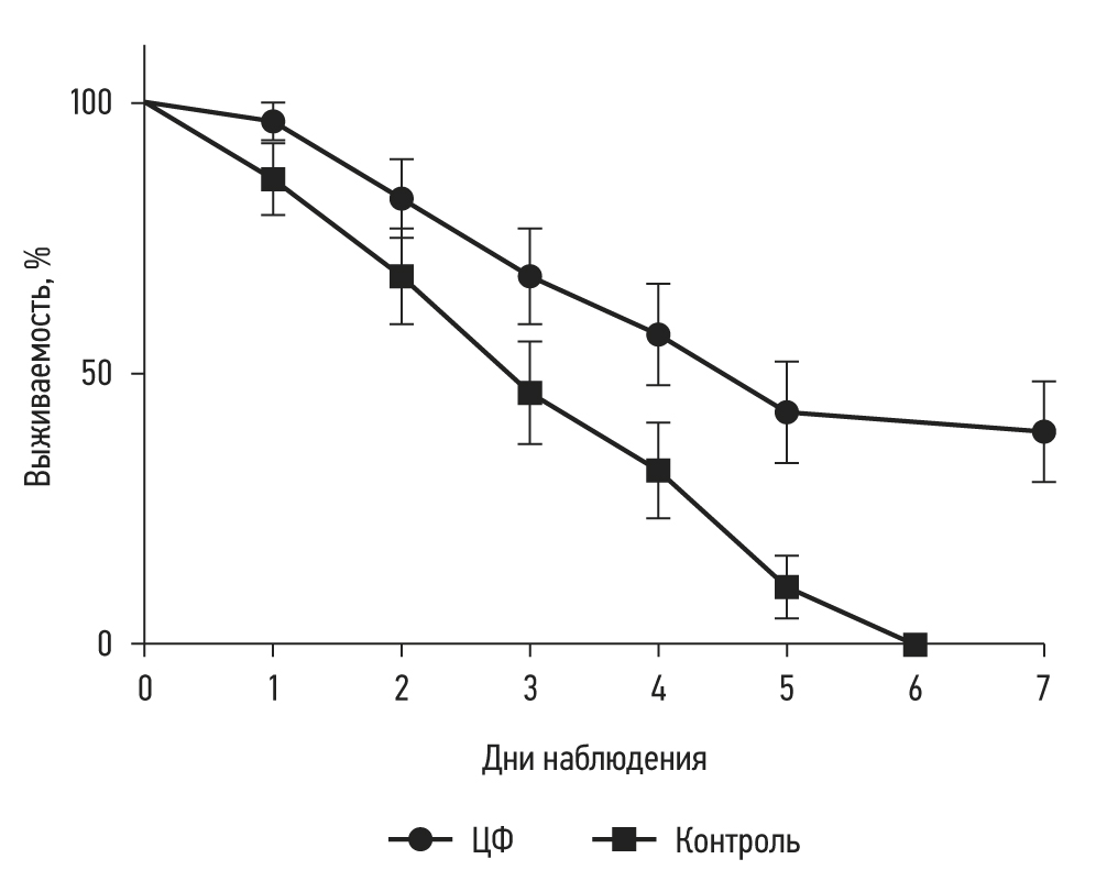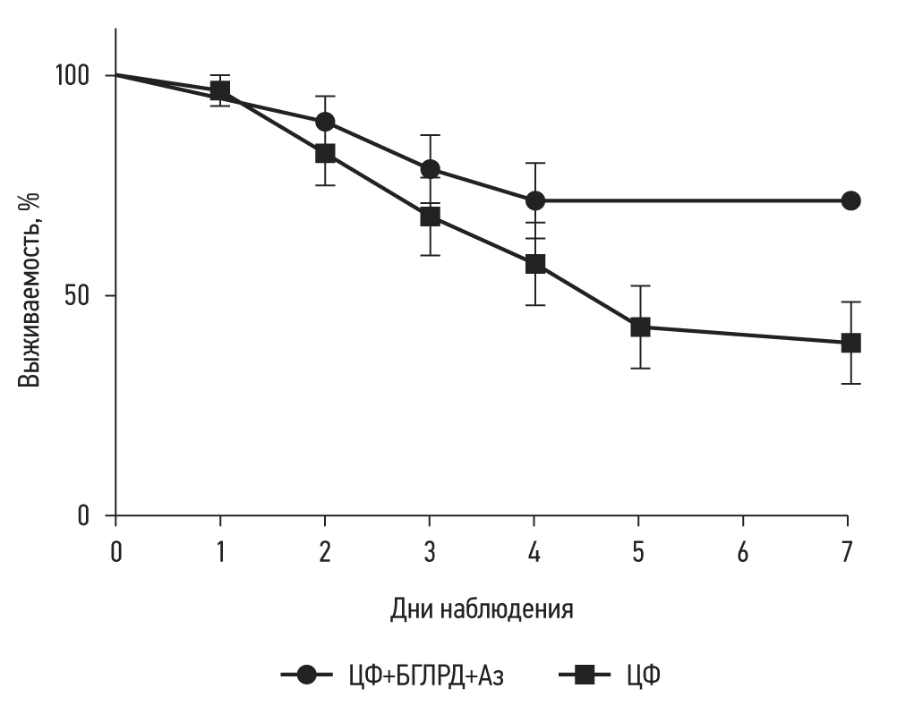 To assess the effect of the studied drugs on the survival of mice with a simulated purulent inflammatory process of the abdominal organs, we compared this indicator in experimental groups of animals with combined administration of CF and HLRD or CF and BHLRD+Az and in a group of mice that received CF as a single drug. Moreover, in this context, animals with CF single administration were considered as the control group. It was revealed that both HLRD and BHLRD+Az increased the survival rate of the experimental animals.