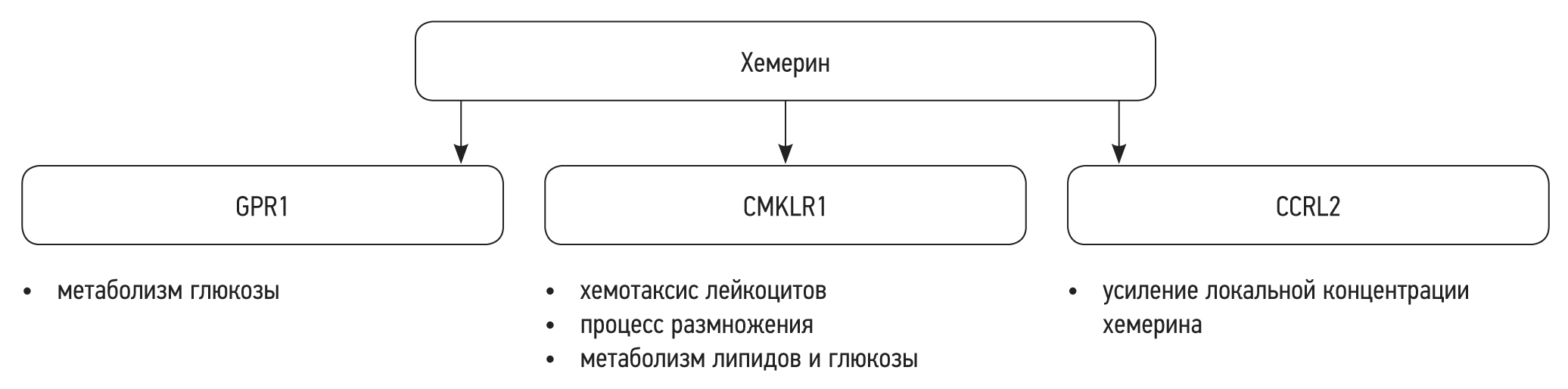 Хемерин — естественный лиганд для хемокин-подобного рецептора 1 (CMKLR1), G-белкового рецептора 1 (GPR1, ChemR23) и C-C мотива хемокина-рецептора 2 (CCRL2), которые были идентифицированы в нескольких тканях и органах [6–9]. Эта молекула связывается с CMKLR1 и GPR1 с одинаковым сродством, но c меньшим сродством к CCRL2 [28]. Экспрессия CMKLR1 зарегистрирована в жировой ткани, клетках иммунной системы, лёгких, плаценте, сердце и костях. CMKLR1 сигнализирует через митоген-активированную протеинкиназу (MAPK), внеклеточную сигнально-регулируемую киназу (ERK) и фосфатидилинозитол-3-киназу/протеинкиназу Akt. Связывание Chemerin/CMKLR1 способствует хемотаксису популяций лейкоцитов к тканям, где происходит воспалительный процесс [28]. Через CMKLR1 хемерин может регулировать остеобластогенную дифференцировку мезенхимальных стволовых клеток [20]. Связывание хемерина с CMKLR1 приводило к прогрессированию пролиферативной ретинопатии при сахарном диабете (СД) [29]. Наибольшая экспрессия CMKLR1 в эндометрии наблюдалась в период плацентации и имплантации [30]. GPR1 экспрессируется в центральной нервной системе, коже и жировой ткани, а также в клетках Лейдига и гранулёзных клетках. Этот рецептор влияет на пути ERK1/2-MAPK и серин/тирозинпротеинкиназ-зависимые (RhoA/ROCK) пути. Роль данного рецептора до сих пор до конца не выяснена [6, 8]. Согласно последним данным, GPR1 играет двойную роль в регуляции активности хемерина: как сигнальный рецептор для передачи сигналов на основе аррестина, с одной стороны, и как рецептор-поглотитель с более широкой лигандной специфичностью — с другой [31]. CCRL2 отличается от двух других рецепторов и наиболее тесно связан с атипичным семейством хемокиновых рецепторов. Основной функцией мембранного белка является закрепление хемерина с целью повышения его местной концентрации. Когда CCRL2 связывается с хемерином, сигнальные пути, мобилизация кальция или интернализация лигандов не активируются [32]. Следует отметить, что хемериновые рецепторы проявляют селективные сигнальные свойства [28]. CMKLR1 функционально важен для центральных эффектов хемерина на регуляцию массы тела и нейровоспаление [33]. Широкое распространение как хемерина, так и его рецепторов обусловливает комплексное влияние на функционирование человеческого организма (рис. 1).