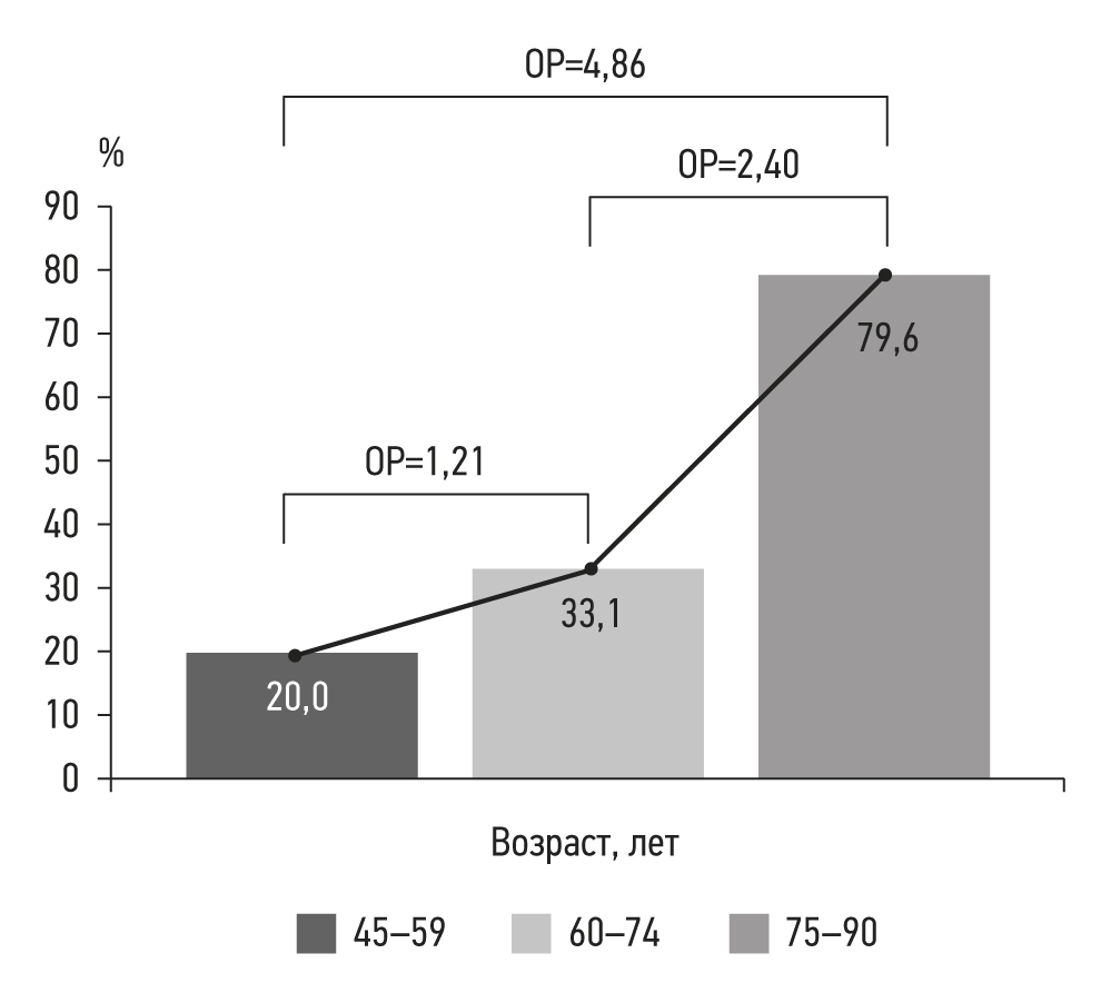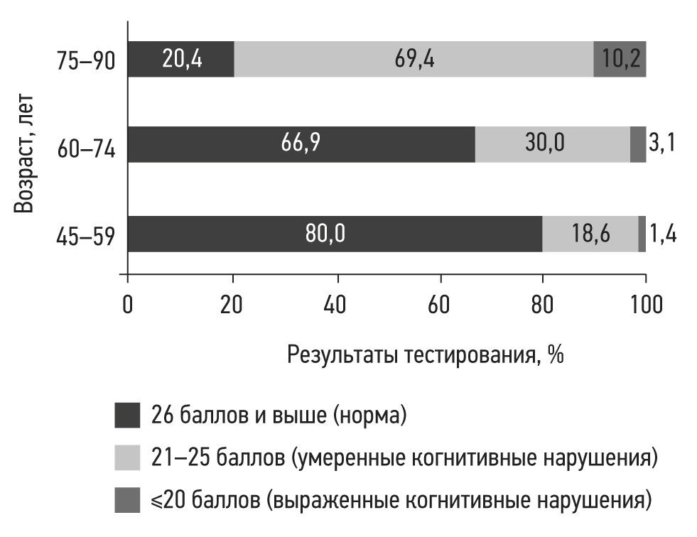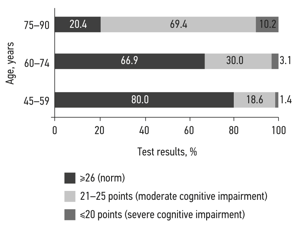 RESULTS: Cognitive dysfunction was noted in 20.0% of patients in the group aged 45–59 years, 33.1% in the group aged 60–74 years, and 79.6% in the group aged 75–90 years. The average results on the assessment of cognitive functions of persons aged 45–59 (27.1±0.3) and 60–74 (26.2±0.2) years corresponded to the norm, and the value in persons aged 75–90 (23.6±0.3) years was below the norm. In groups aged 60–74 and 75–90 years, the prevalence of cognitive dysfunction was comparable between men and women. Cognitive impairments in men aged 45–59 years were recorded 2.5 times more often than that in women. The risk of cognitive disorders in the second group (aged 60–74 years) relative to that in the first group (aged 45–59 years) is insignificant (relative risk [RR], 1.21). In the third group (aged 75–90 years), the probability of cognitive disorders is significantly higher than that in the second group (RR=2.40) and nearly five times higher than that in the first group (RR=4.86).