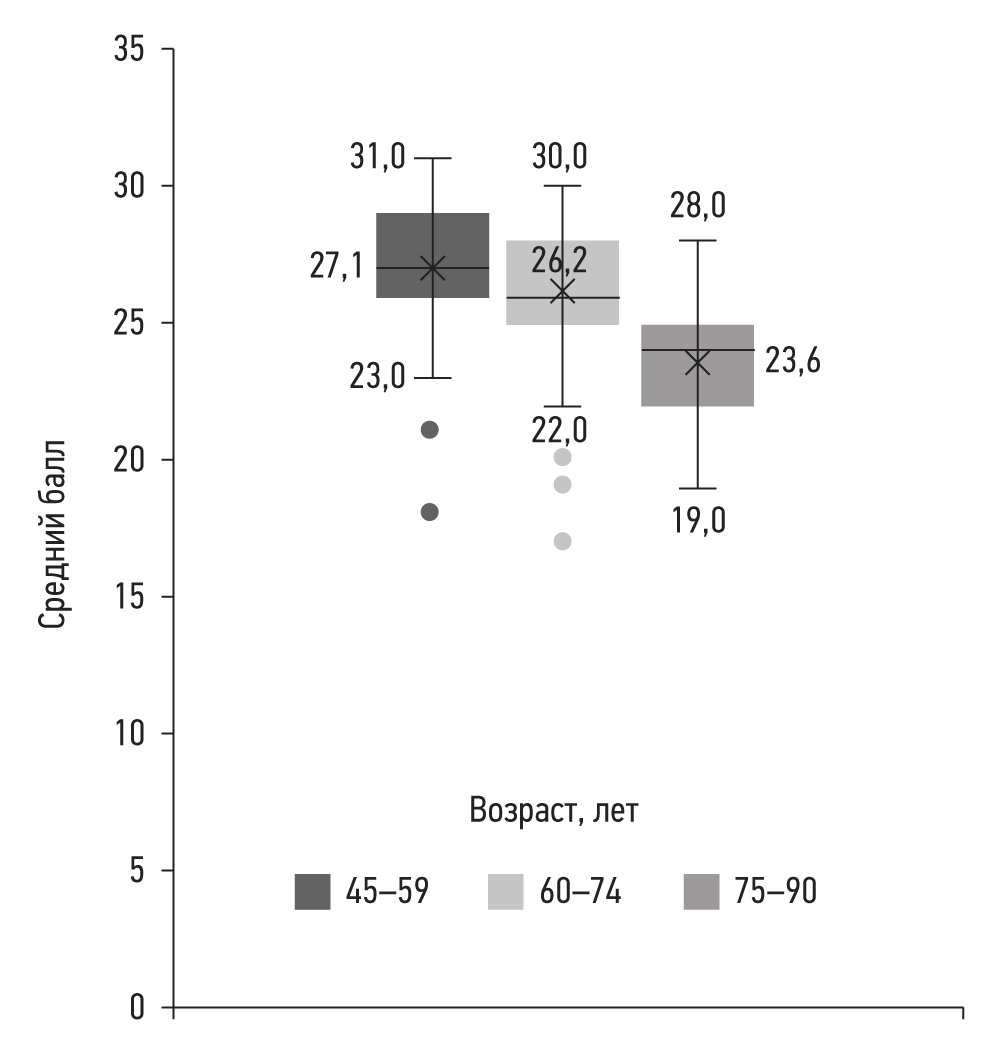 The average score for assessing cognitive functions in the studied groups decreased with increasing age, and in patients aged 75–90 years, this indicator shifted into the range of severe cognitive impairment, which is evidence of intellectual pathology. In general, the data obtained are consistent with the results of population-based studies [10] and meta-analyses [8] on the epidemiology of cognitive impairment. This enables us to conclude that screening studies organized at outpatient medical care facilities can be an “entry gate” for more widespread epidemiological studies of cognitive pathology.