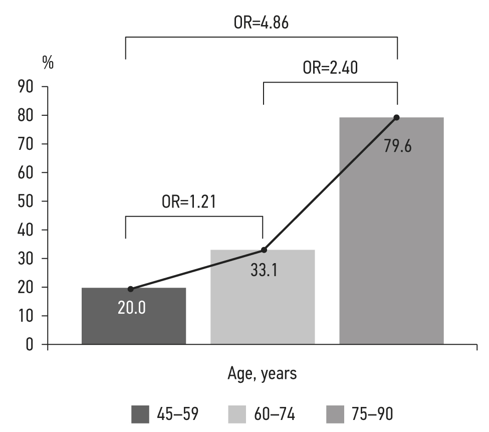 Comparison of indicators in different age cohorts demonstrated an obvious tendency toward an increase in the proportion of patients with cognitive impairment with increasing age (Fig. 3). The RR for the development of cognitive impairment with increasing age when comparing groups 1 (45–59 years old) and 2 (60–74 years old) was 1.21 (95% CI 1.02–1.42; p <0.05). When comparing groups 2 and 3 (75–90 years old), the RR was 2.40 (95% CI 1.85–3.12; p <0.05). When comparing groups 1 group 3, the RR was 4.86 (95% CI 2.68–8.79; p <0.05).