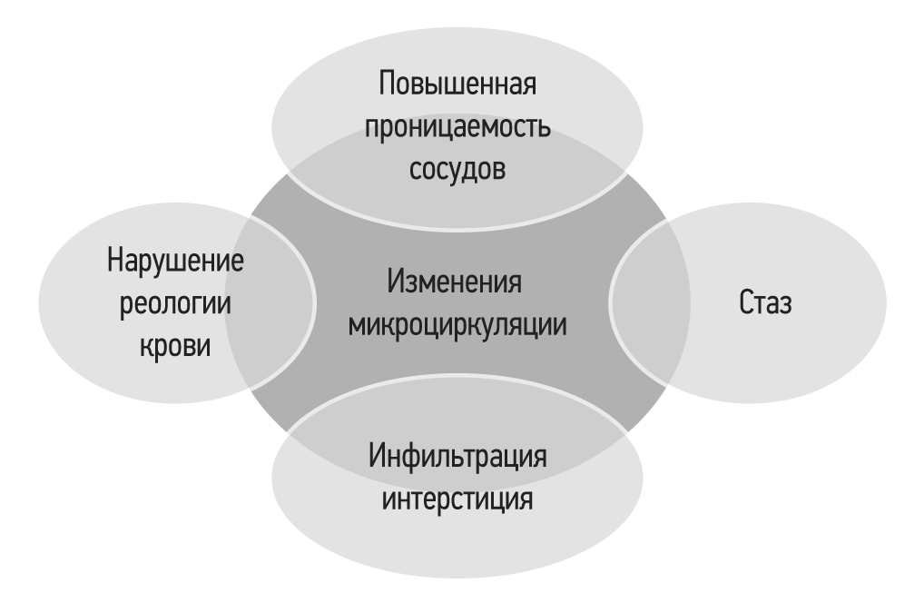 Последовательность и преемственность патофизиологических нарушений, происходящих на уровне различных функциональных систем (реологической, эндотелия сосудов, интерстиция), которые претерпевают каскад физико-биохимических преобразований, составляют целостность взаимодействий. Всё это представляется гораздо более сложным, чем обычные причинно-следственные или обратные связи функциональных согласований на уровне сигнальных медиаторов, клеток, тканей, нарушения осмоса и т.д. [1]. Совокупность этих изменений, их цикличность обладают как свойствами взаимоотягощения (порочный круг), так и параметрами, направленными на борьбу с микробной альтерацией и формирование защитных механизмов на различных уровнях системы [2].