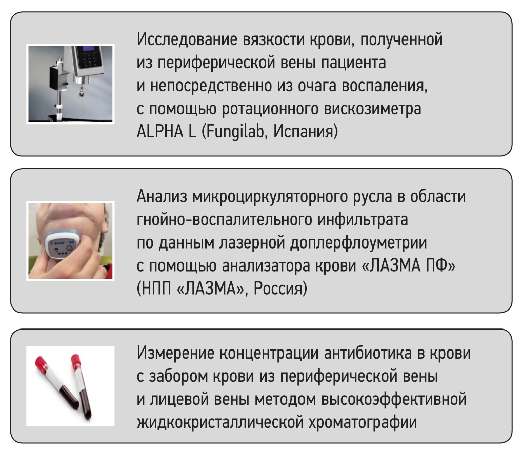 Fig. 2. Research methods employed to examine impairments in blood rheology and microcirculation in the purulent infiltration area in patients with maxillofacial phlegmon.