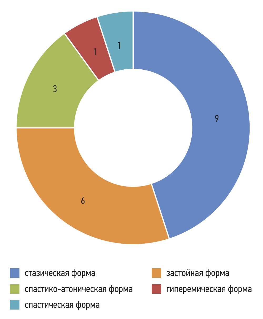 Fig. 5. Types of microcirculatory disorders in the purulent inflammation area in patients with phlegmon of the maxillofacial region (n=20).