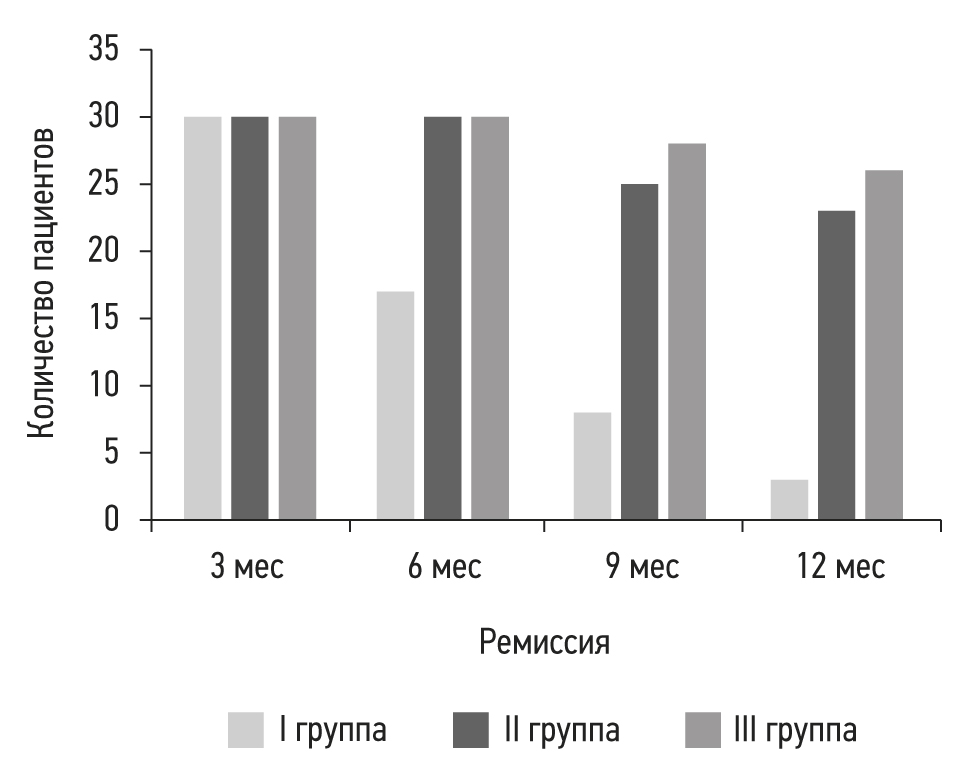 Эффективность проводимого лечения оценивали в динамике по длительности ремиссии в течение 12 мес. Не зафиксирован рецидив синовита во всех трёх группах в течение первых 3 мес у 100% пациентов. Рост рецидивов синовита отмечен через 3 мес в І группе, во ІІ и ІІІ группах — через 6 мес. Через 12 мес показатель длительности ремиссии в І группе составил 10% (3 пациента), во ІІ группе — 73,3% (23 пациента) в ІІІ группе — 86,6% (26 пациентов). Динамика роста количества рецидивов синовита в группах отражена на рис. 1. При этом необходимо отметить, что рецидив синовита после гипотермии протекал со значительно меньшими клиническими проявлениями.