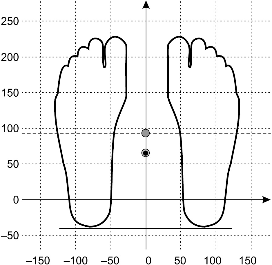 Положение стоп пациента на стабилометрической платформе во время исследования. Американский вариант, глаза открыты.