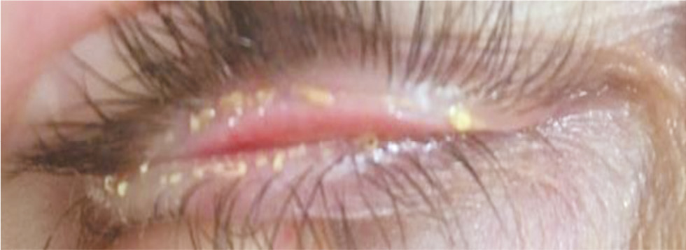 Fig. 1. Presence of thick, pasty meibomian gland secretion in patient D. with hyposecretory meibomian gland dysfunction before treatment.