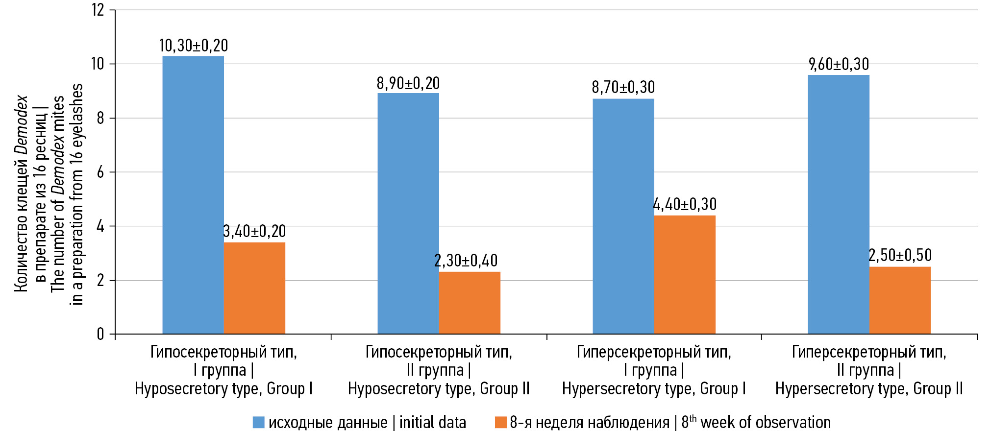 Table 3. Comparative evaluation of acarograms in patients of study groups with chronic blepharitis and meibomian gland dysfunction on the background of different therapy regimens (n=28, 56 eyes) (points, M±m)