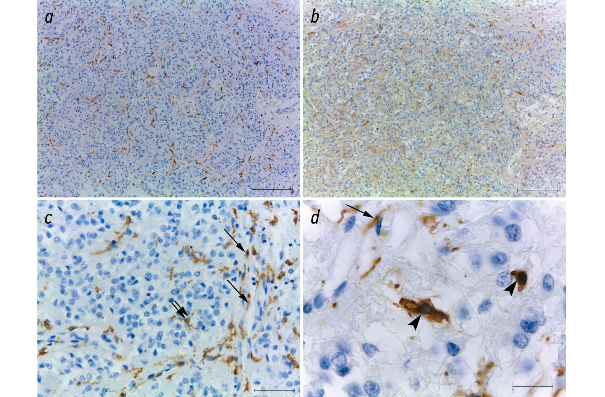 Fig. 1. Preferential localization of microglia/macrophages in the trabeculae of the pineal gland of the human brain. Immunohistochemical reaction for Iba1 (a, c, d) and TMEM119 (b); nuclei stained with alum hematoxylin; a, b — difference in the number of Iba1- and TMEM119-immunopositive cells on consecutive sections of the pineal gland; c, d — different morphotypes of microglia: single arrow (d) indicates perivascular microglia, double arrow — ramified microglia, arrow heads — amoeboid microglia. The scale bar is 200 μm (a, b); 50 μm (c), and 20 μm (d).