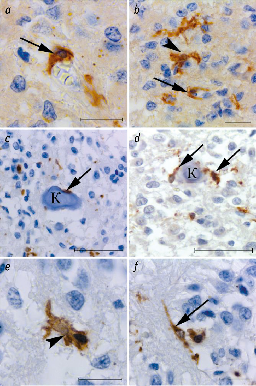 Fig. 2. Microglia of the human pineal gland. Immunohistochemical reaction to TMEM119 (a, b, d) and Iba-1 (b, e, f). Nuclei are stained with alum hematoxylin. Arrows indicate perivascular microglia (a, b); microglia adjacent to calcificates — К (c, d); microglia localized at the border of trabecula and parenchyma (f); arrow heads indicate phagocytic microglia (b, e). The scale bar is 20 μm.