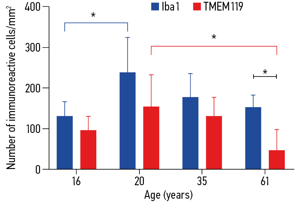 Serial sections stained for Iba1 and TMEM119 were quantitatively analyzed. A total of 4 cases in patients aged 16, 20, 35, and 61 years were included. Immunopositive cells were counted in 5 fields of view for each case.