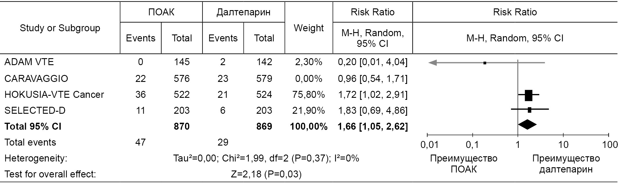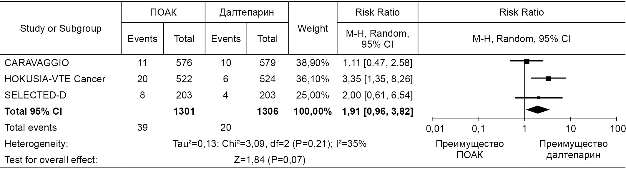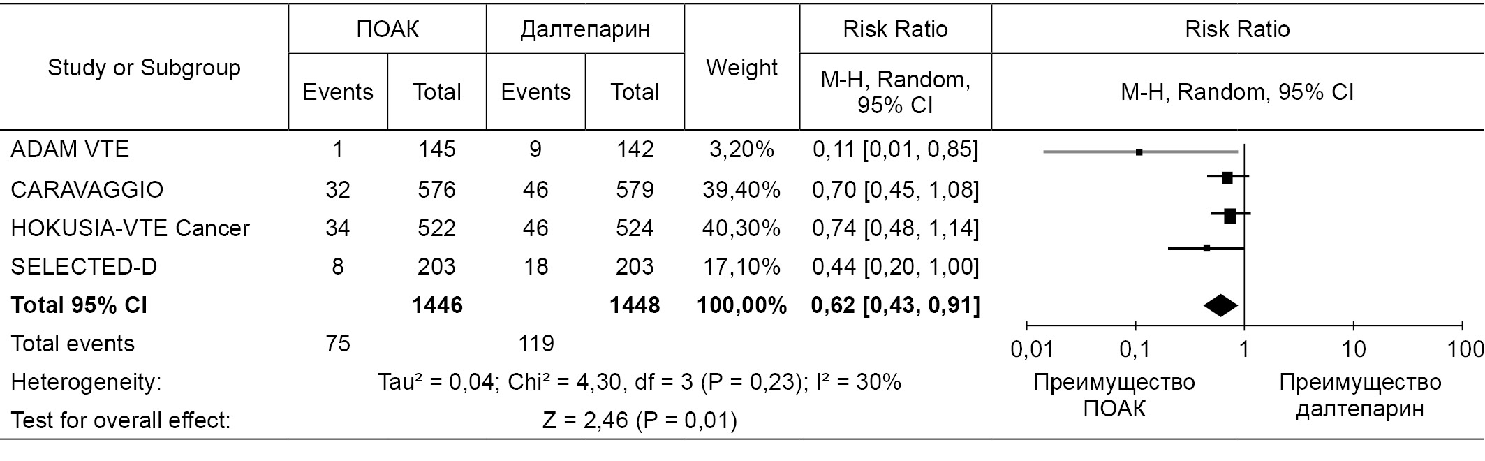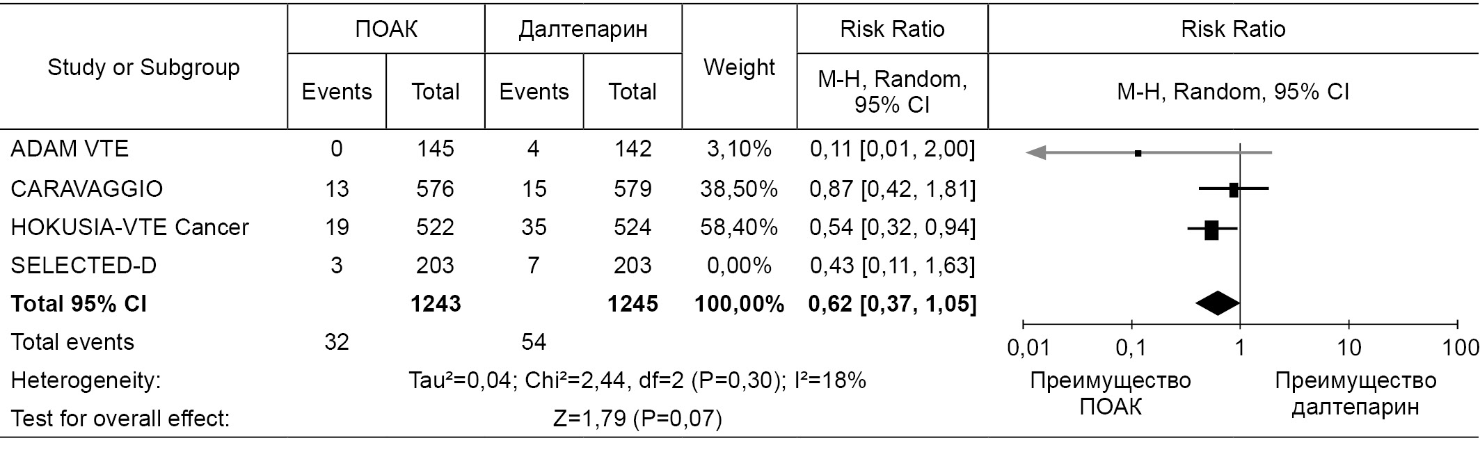 В настоящее время опубликованы результаты рандомизированных клинических исследований по изучению эффективности и безопасности ПОАК у онкологических больных SELECT-D [19, 20]; ADAM VTE [21] и CARAVAGGIO [22]; HOKUSAI-VTE Cancer [23], которые легли в основу данного анализа.