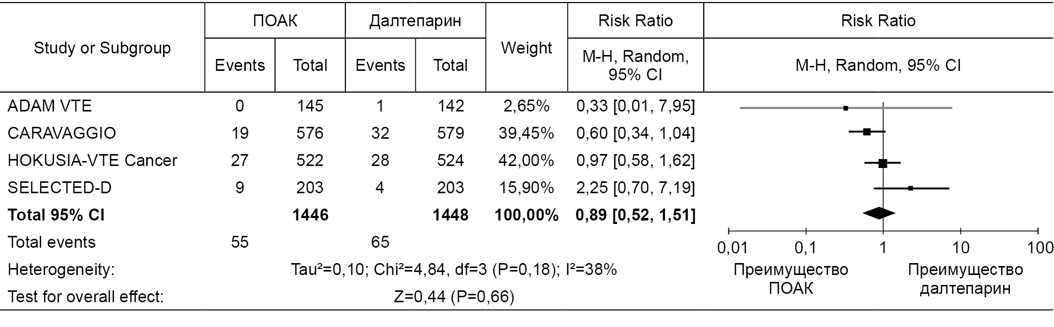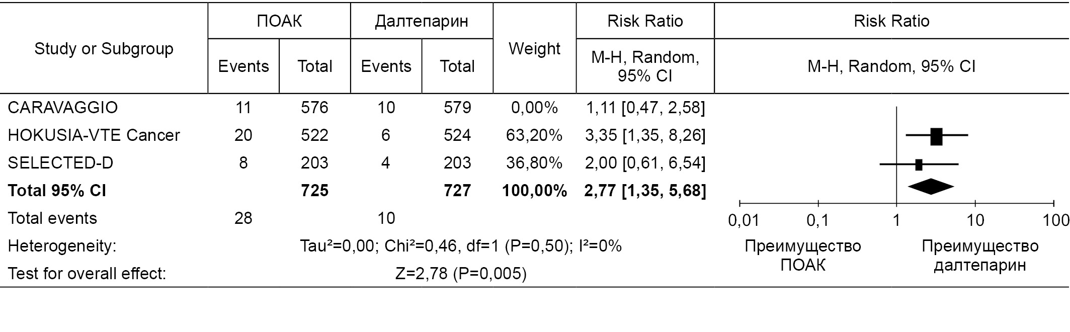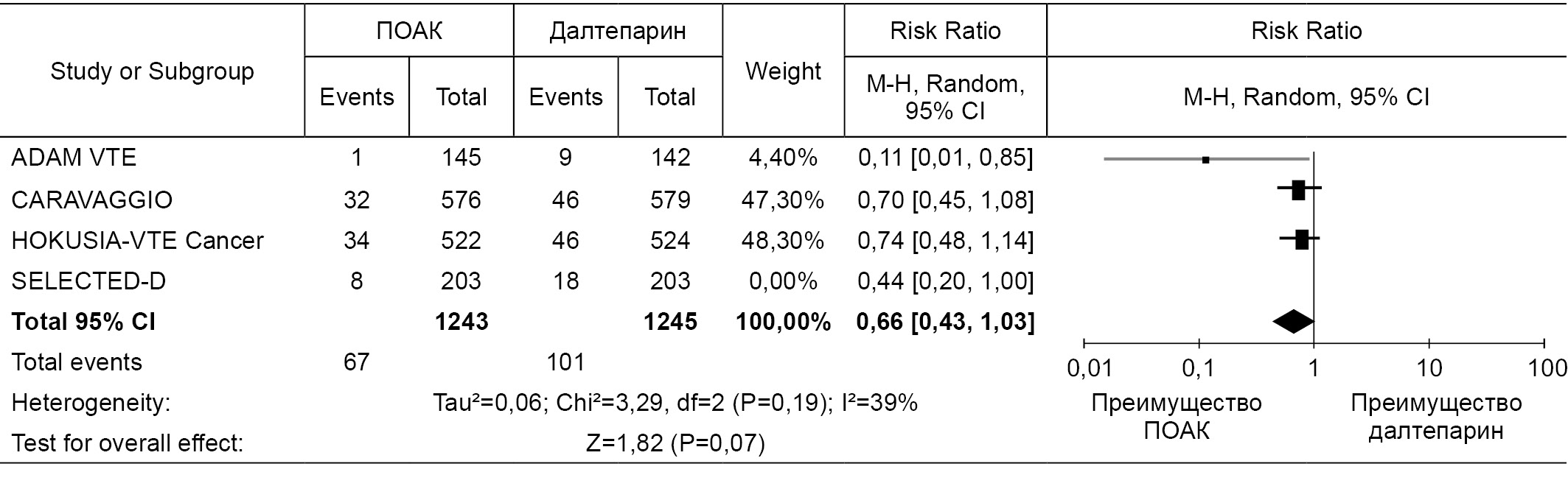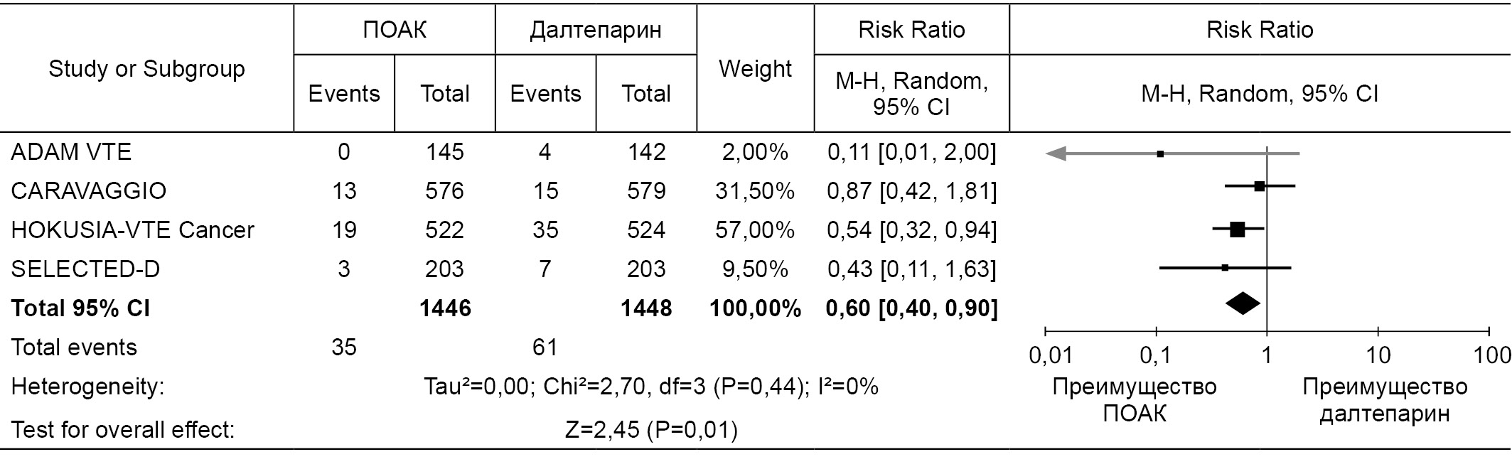 В настоящее время опубликованы результаты рандомизированных клинических исследований по изучению эффективности и безопасности ПОАК у онкологических больных SELECT-D [19, 20]; ADAM VTE [21] и CARAVAGGIO [22]; HOKUSAI-VTE Cancer [23], которые легли в основу данного анализа.