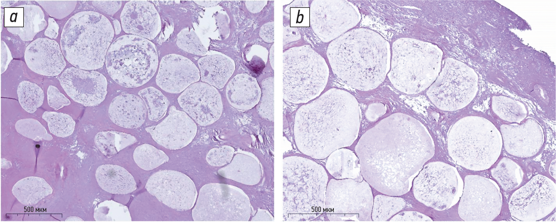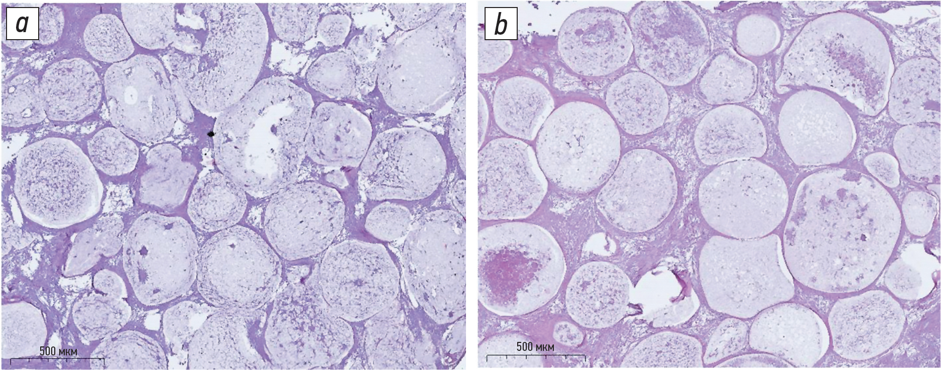 Fig. 2. The bone regenerate from the maxillary sinus floor, containing spherical granules of the bone graft material, around which, in the presence of simvastatin, mature (lamellar) bone tissue occupies a larger area of the regenerate surrounding the material (a); without simvastatin load — a small amount of predominantly lamellar bone tissue (b). Haematoxylin and eosin staining.