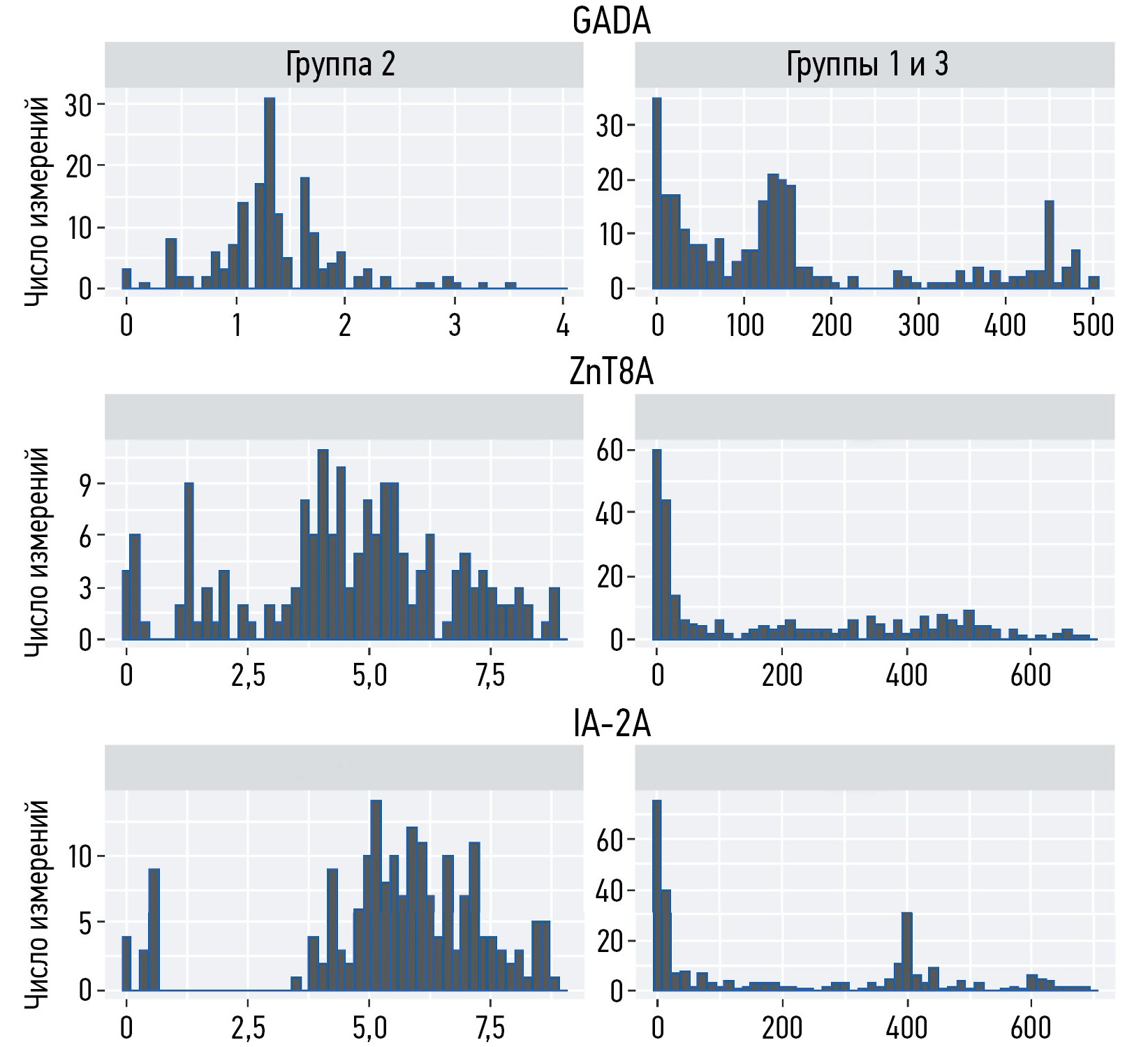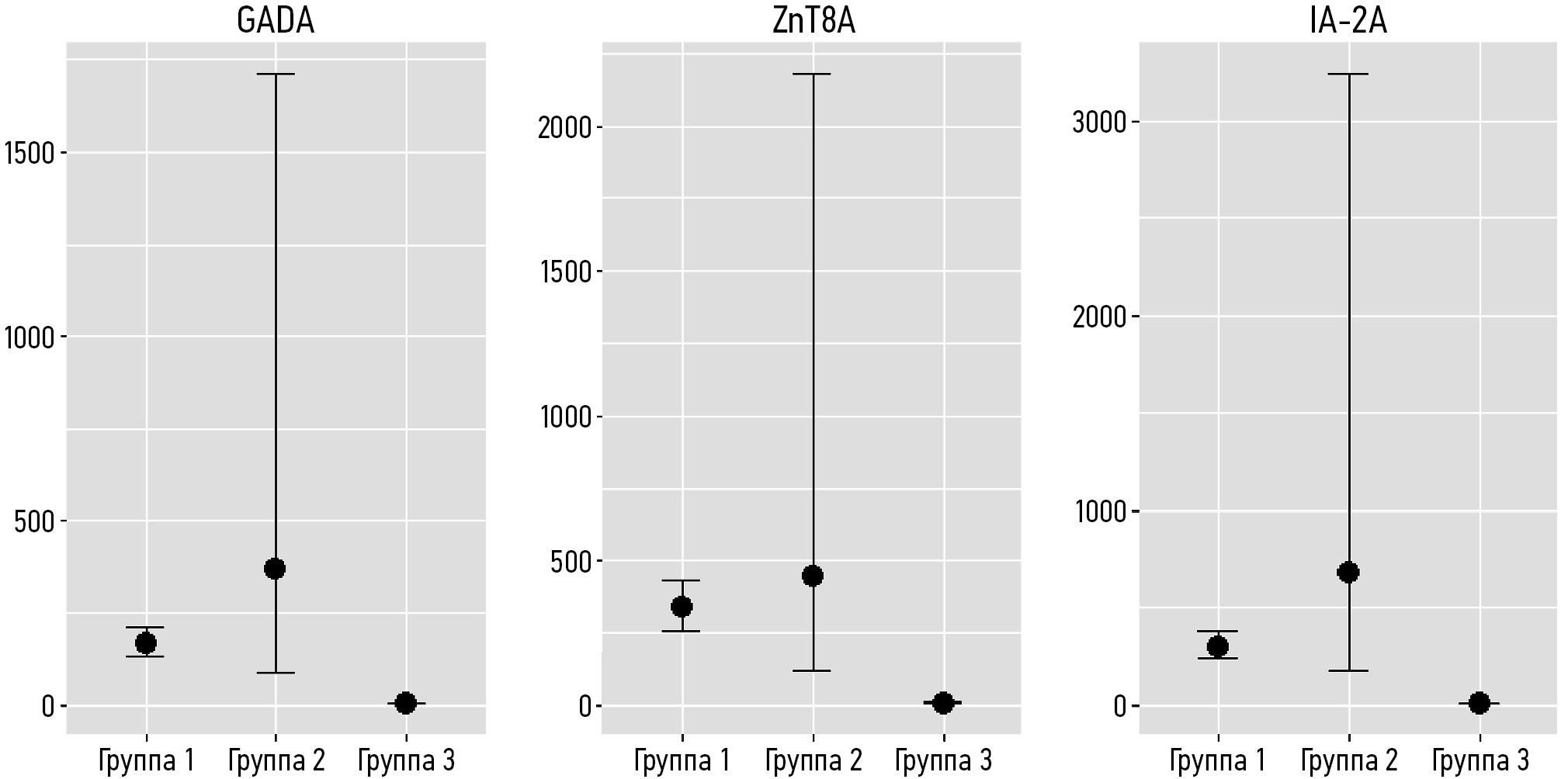 Различия инициальных концентраций в группах 1 и 3 по сравнению с группой 2 были статистически значимы — тест Краскела–Уоллиса: χ2=166,04; df=1; p <0,0001 для IA-2A; χ2=228,01; df=1; p <0,0001 для GADA; и χ2=192,73; df=1; p <0,0001 для ZnT8A (табл. 2).