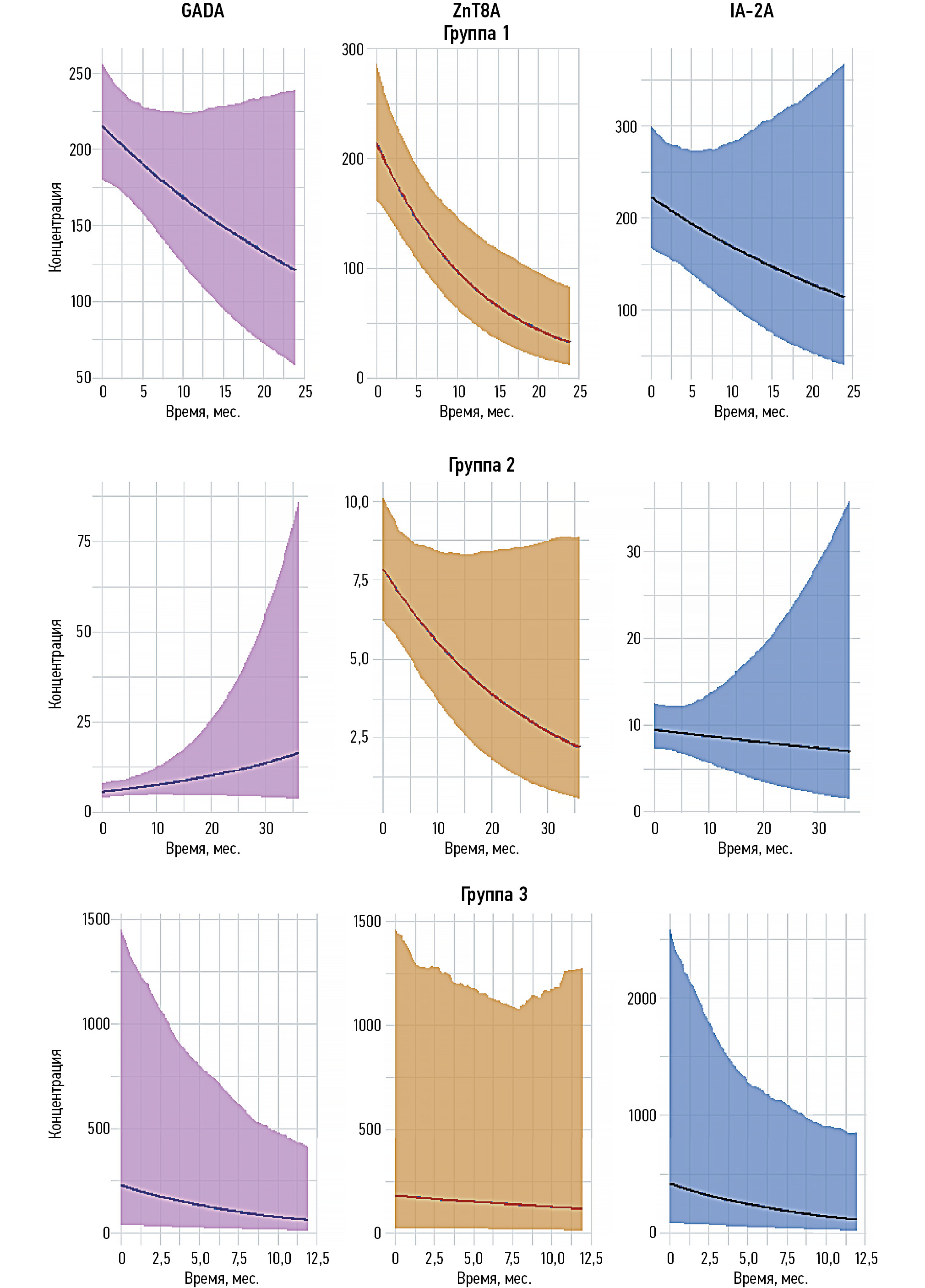Динамика концентраций аутоантител была специфической в исследуемых группах. В группе 1 концентрации GADA и IA-2A снижались плавно и статистически незначимо, хотя вероятность отрицательных значений коэффициентов регрессии была явно выше. В этой группе концентрация ZnT8A уменьшалась довольно быстро и значимо.