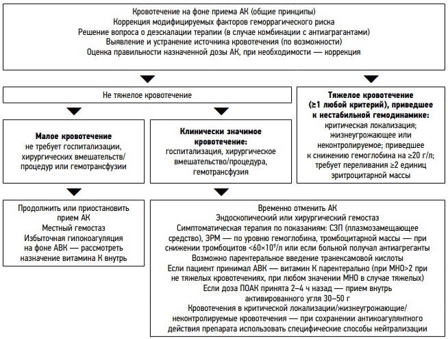 Рис. Общие принципы лечения кровотечений у пациентов, получающих оральные антикоагулянты. АВК — антагонисты витамина К; АК — антикоагулянты; ПОАК — пероральные антикоагулянты; СЗП — свежезамороженная плазма; МНО — международное нормализованное отношение; ЭРМ — эритроцитарная масса.