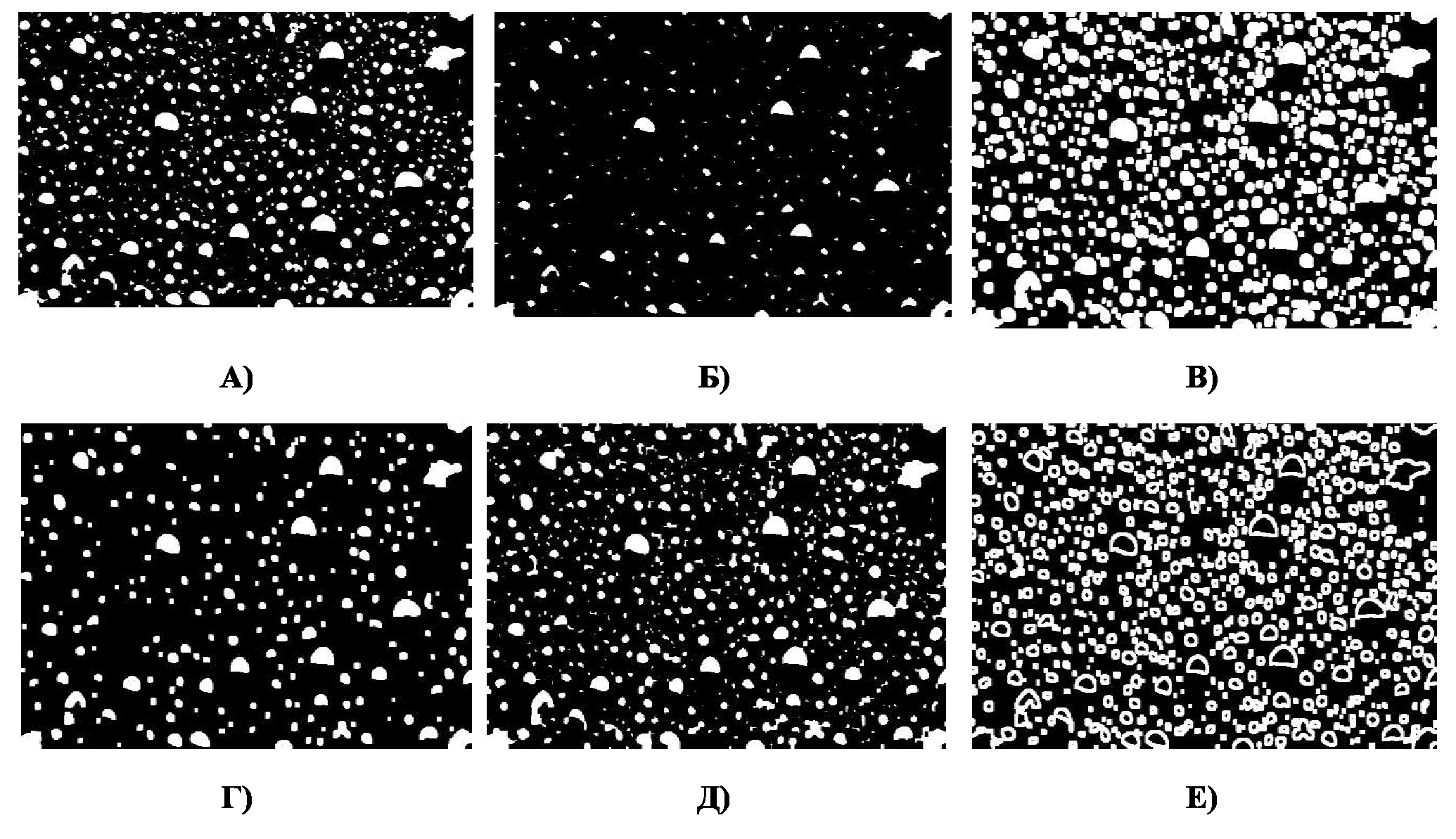 Fig. 6. А) The result of the binarization operation. Б) The result of the erosion operation. В) The result of the dilation operation. Г) The result of the opening operation. Д) The result of the closing operation. Е) The result of applying a morphological gradient