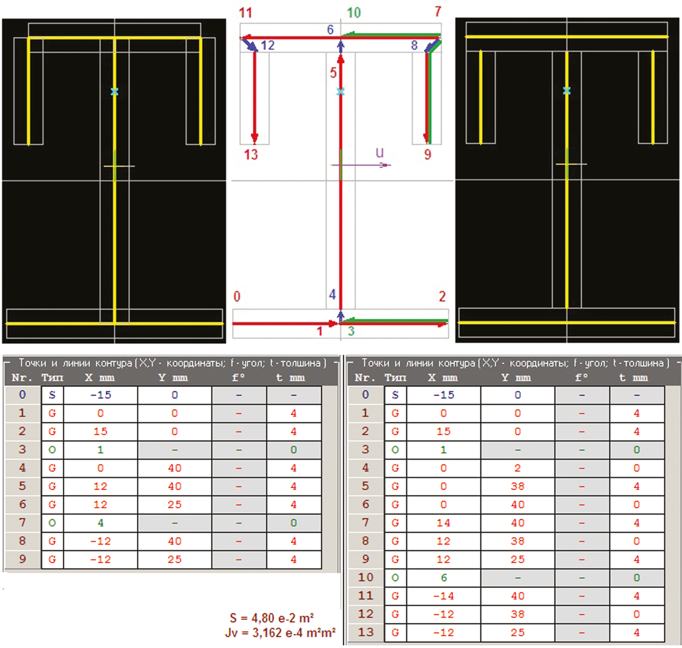На рис. 1 показана схема последовательности задания поперечного сечения линиями с разветвленным профилем. Позиции, имеющие тип «О», означают возврат в ранее отмеченную точку. Остальные позиции те же, что при изображении массивного контура с добавлением толщины линии. Для расчета тонкостенных криволинейных профилей использован существующий метод с дополнениями, позволившими автоматизировать расчет разветвленных профилей. Такие профили рассчитываются как одна непрерывная линия, некоторые участки которой могут иметь нулевую толщину, для большей наглядности программа изображает толщину листа. Отрезки нулевой толщины не рисуются, но присутствуют в таблице участков профиля. Наличие этих элементов позволяет автоматизировать возврат в точку ветвления и избегать двойного учета накладывающихся площадей, что повышает достоверность рассчитанных характеристик.