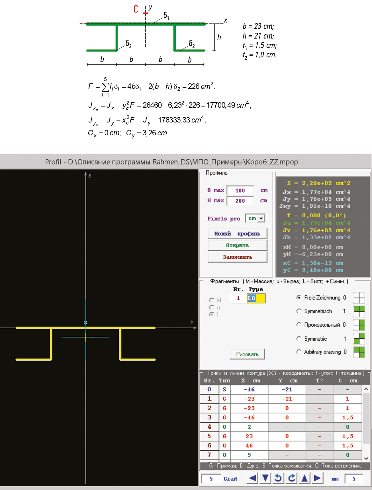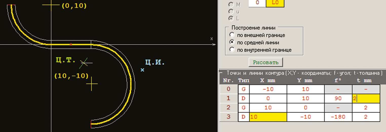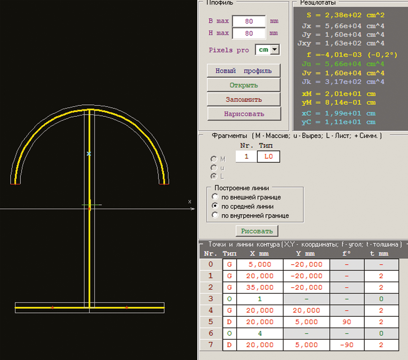 Главной целью расчета является определение положения центра кручения-изгиба. На рис. 2 представлен расчет тонкостенного прямолинейного профиля. По алгоритму находим центр тяжести площади сечения и главные центральные оси инерции, которые затем используются для нахождения центра кручения. Нами проведено сравнение с расчетами некоторых тонкостенных незамкнутых профилей по существующим методикам, представленным в учебной литературе. Совпадение данных весьма высоко, что позволяет с уверенностью использовать программу для расчета многих типов тонкостенных профилей.