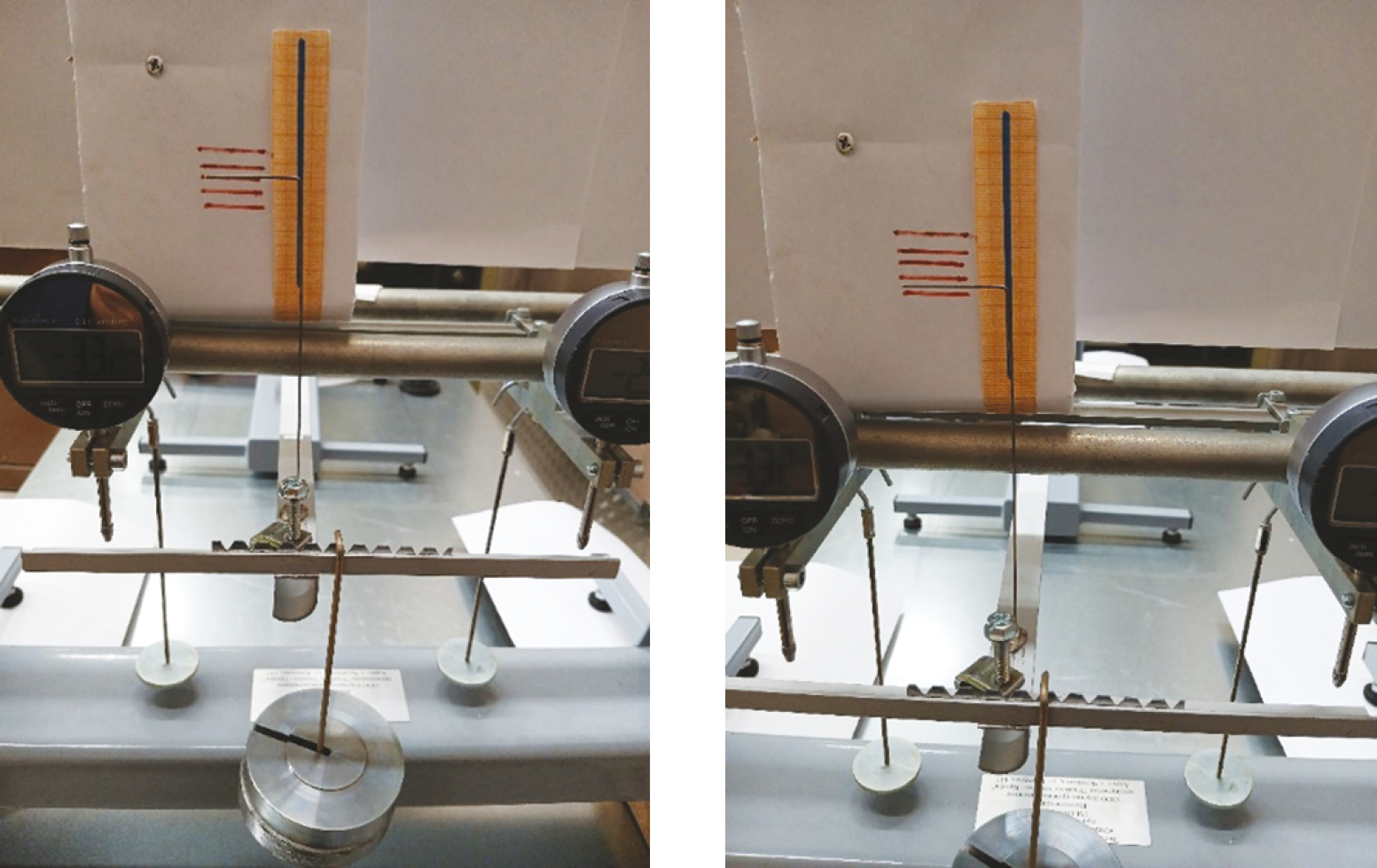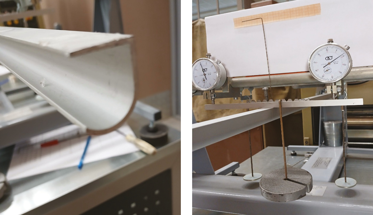 Для наглядного изучения деформации балки тонкостенного профиля был проведен отдельный эксперимент. С этой целью на поверхность балки был закреплен «маячок» в виде тонкого Г-образного очертания. Подвес с грузом устанавливался на гребенку в том месте, где были получены точки пересечения графиков (рис. 8) с нейтральной осью. Представленный фотоматериал наглядно свидетельствует об отсутствии кручения балки, а прогиб происходит в вертикальной плоскости, то есть с отсутствием малейшего намека на кручение (рис. 9).