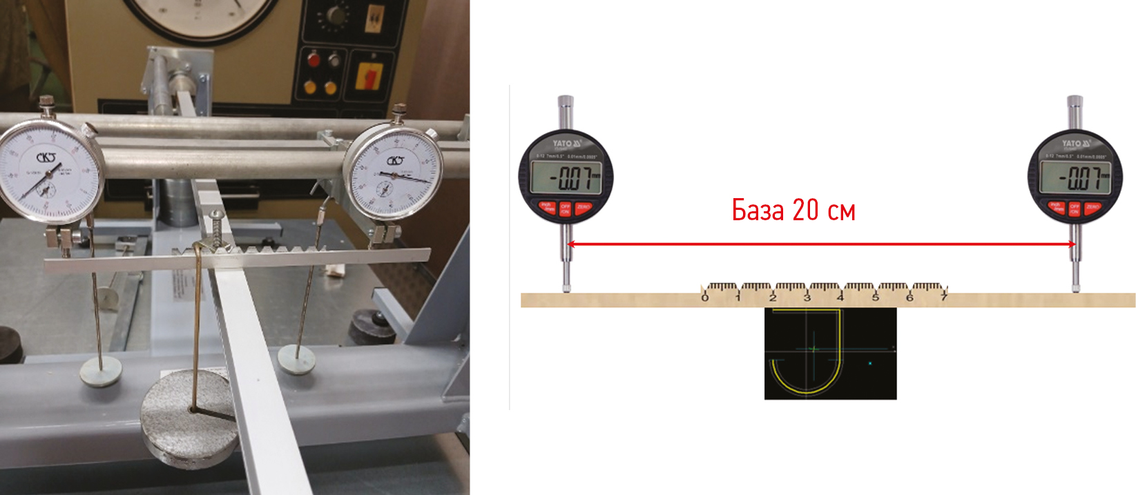 На прямолинейной стороне балки (рис. 6) прикреплена гребенка с делениями в 10 мм, с помощью которой контролируют положение гиревого подвеса. На расстоянии 20 см по обеим сторонам гребенки устанавливаются индикаторы, которые фиксируют прогиб конца балки при установленной плоскости нагружения. При перемещении подвеса с грузом слева направо измеряются деформации по обоим индикаторам, после чего вычисляется разность приращений левого и правого. По мере приближения к центру кручения разность приращений уменьшается, и положение самой точки кручения будет там, где приращения изменяют свой знак. При этом показания одного из индикаторов, укрепленных на гребенке, увеличиваются, а другого уменьшаются. Особенностью лабораторной установки является использование в качестве измерительного инструмента обычной линейки, закрепленной вблизи направляющей, по которой переставляется подвес с грузом.