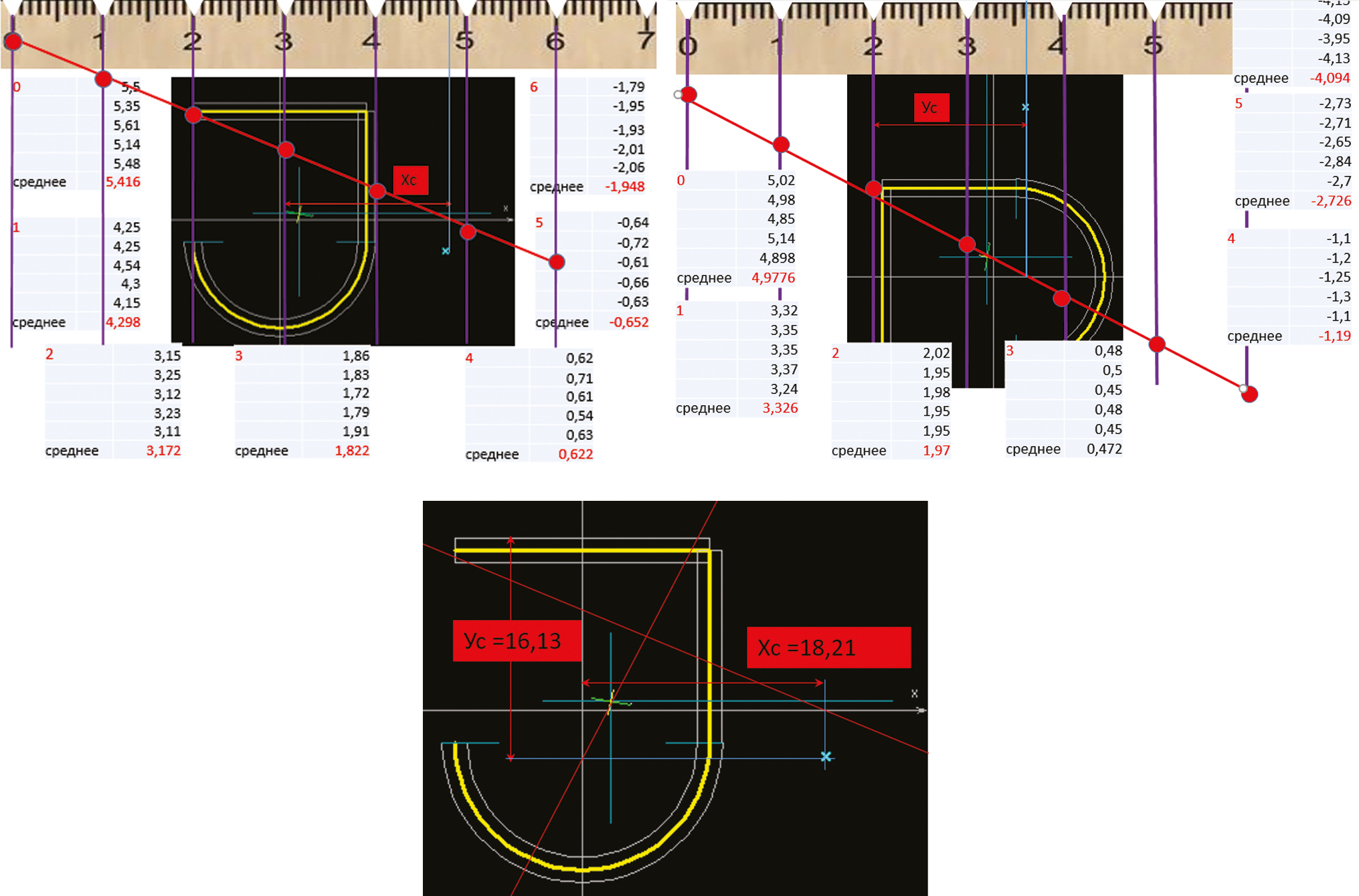 - Построить совместный график, наложенный на расчетное сечение по электронной программе, проверить точность теоретического расчета координат центра кручения и опытных значений (рис. 7).