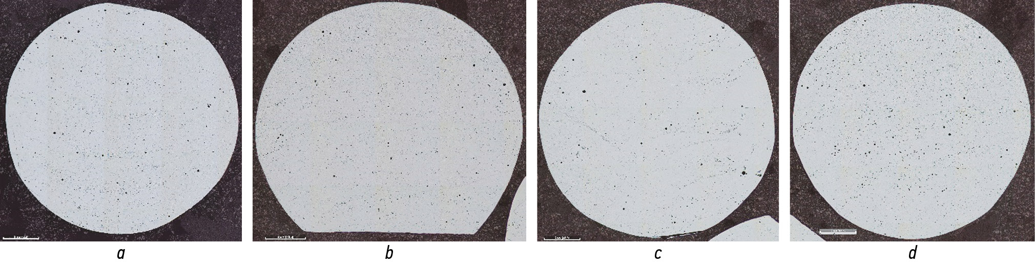 Fig. 5. Large sections: a, linear oscillations normal to the manufacturing path (porosity 0,93%); b, elliptical oscillations along the manufacturing path (porosity 0,98%); c, linear oscillations at a 45 degree angle to the manufacturing path (porosity 0,88%); d, zigzag (porosity 0,90%).