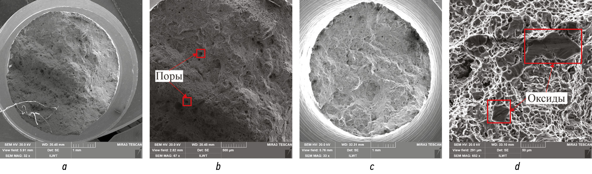 Fig. 7. Fractures view: a, general view, axis Х; b, pores, axis Х; c, general view, axis Z; d, oxide-rich areas, axis Z.