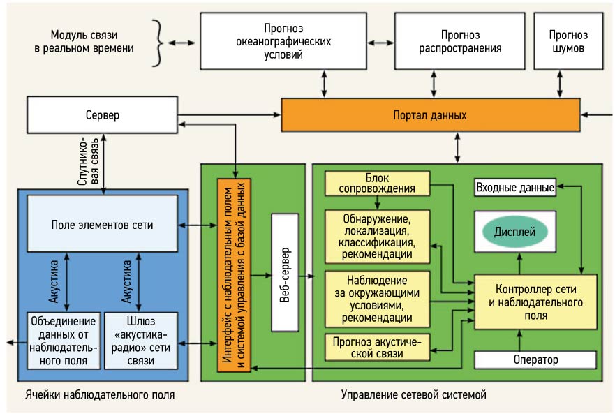 Система, представленная в виде схемы, называется информационно-управляющей. На самом деле, это комплекс, объединяющий сбор, обработку и представление данных от сенсоров, таких как внешние антенны и датчики, включая информационно-управляющую часть. Элементы сети имеют возможность передачи данных и управления по акустическим и комбинированным каналам, таким как «акустика – радио» и «акустика – спутниковая радиосвязь». Данные, полученные под водой, передаются через серверы на обработку в систему сбора, обработки и управления. Кроме того, принимаются данные от системы оперативной океанографии для оценки и прогнозирования условий окружающей среды.