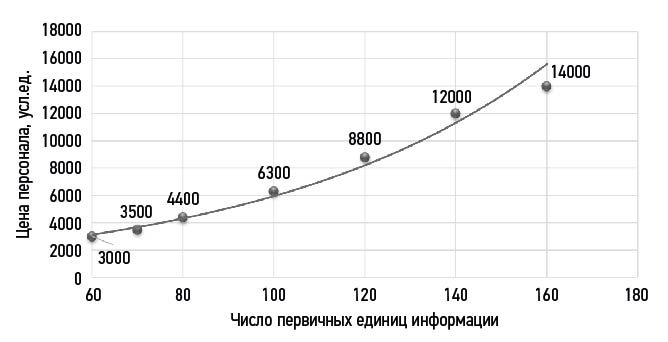 Fig. 9. Influence of the amount of processed information on labor costs when the headcount is reduced.
