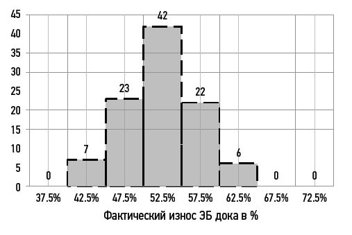 По результатам анализа нормативного износа поперечного сечения корпуса плавучего дока с применением специальной методики, основанной на случайном моделировании скоростей износов с использованием датчиков случайных чисел, были получены результаты, которые показали: