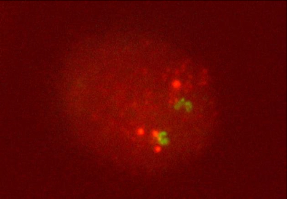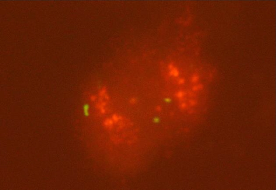Рис. 1. Опухолевая клетка плоскоклеточного рака языка с амплификацией гена CCND1 (красные сигналы)