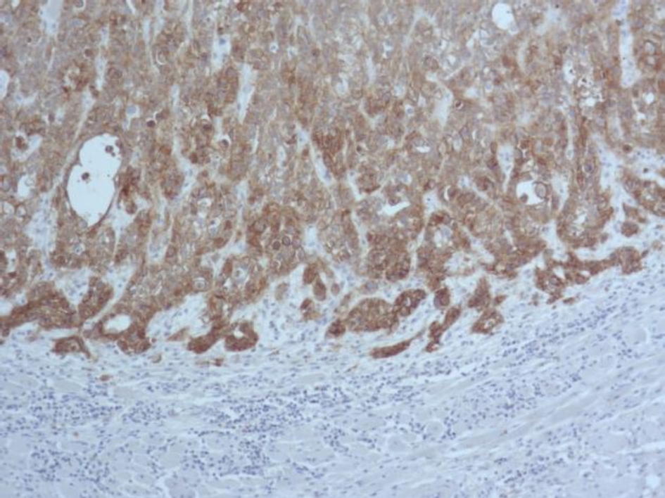 Во всех 19 исследуемых наблюдениях проведено дополнительное параллельное иммуногистохимическое исследование по выявлению экспрессии белков EGFR и Cyclin D1 соответственно, при этом диффузная, преимущественно умеренная экспрессия EGFR опреде-лялась в 17 (89 %) из 19 наблюдений (рис. 3), очаговая слабая экспрессия – в двух наблюдениях (11 %).