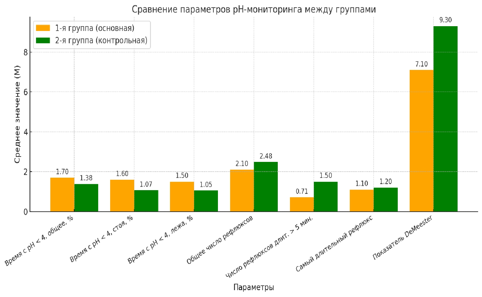 Суточная pH-метрия: выполнялась до операции и через 12 месяцев после вмешательства для оценки кислотного рефлюкса. Анализировались такие показатели, как общее время с pH < 4, количество рефлюксов длительностью более 5 ми-нут и индекс DeMeester.
