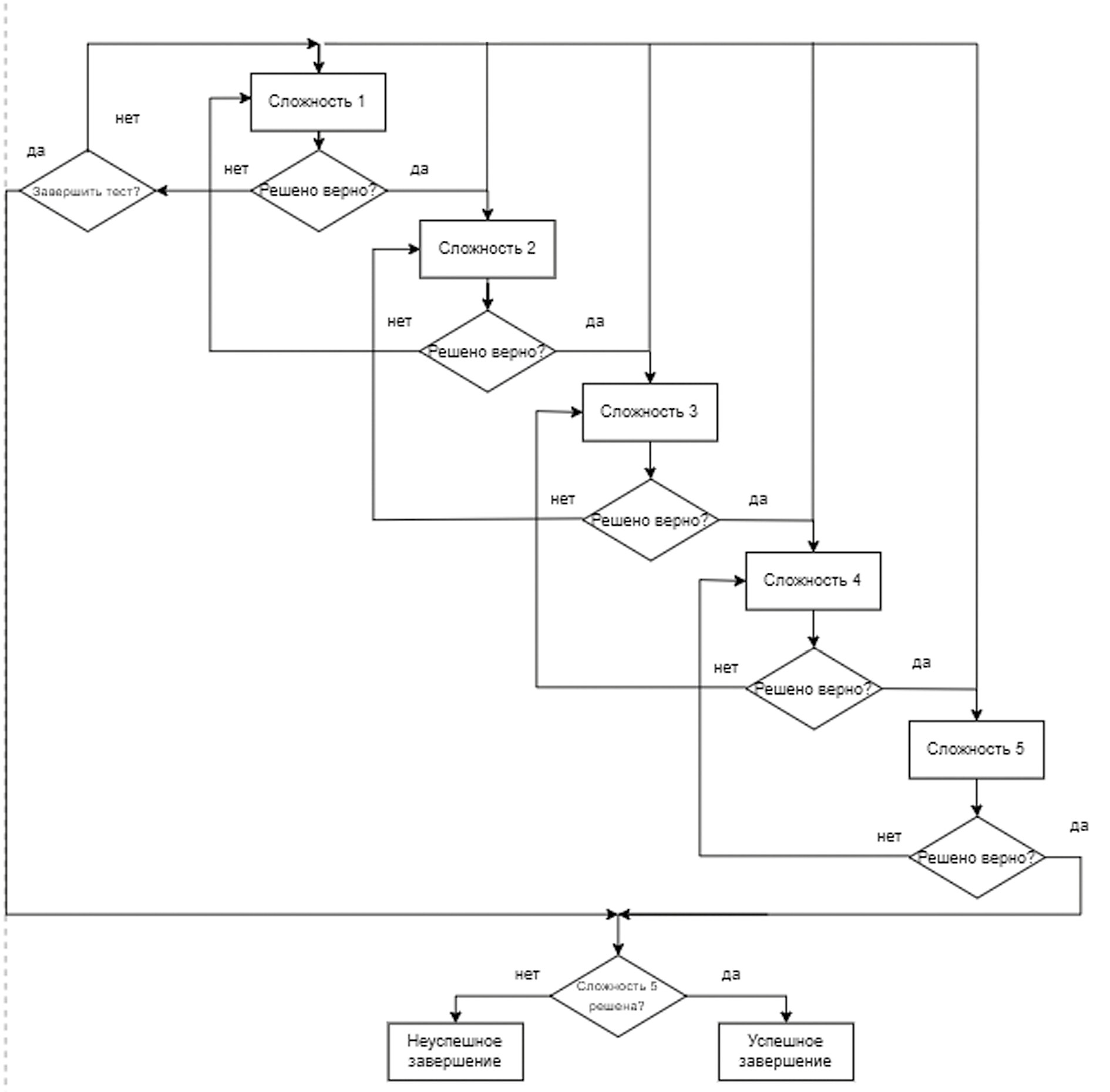 Согласно алгоритму, ученики начинают с того уровня сложности, который был определен входным тестированием. Если ученик правильно выполняет задание, уровень сложности задачи повышается, если неправильно, то понижается. Успешно завершить тестирование можно только в случае, если правильно решена задача самого высокого уровня сложности.
