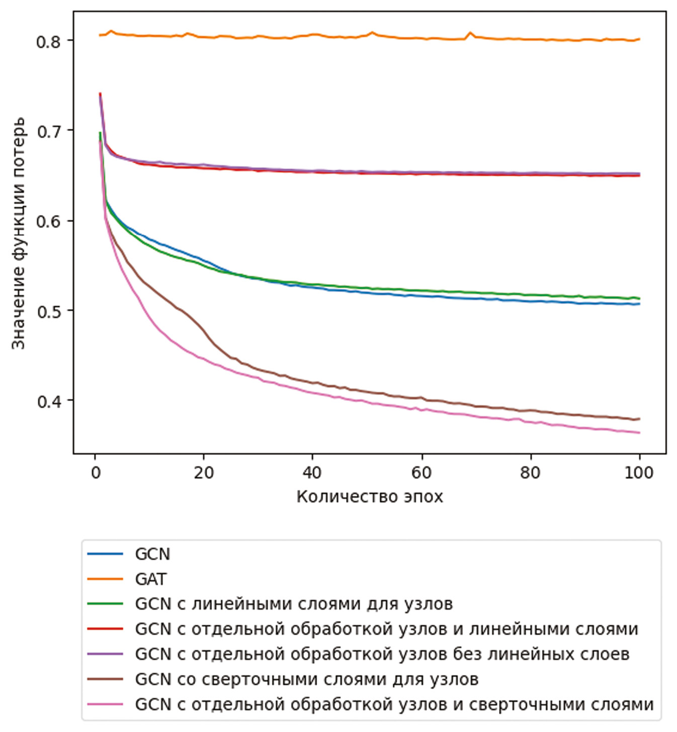 На рисунке 3 приведен график функции потерь для различных реализаций графовых нейронных сетей.